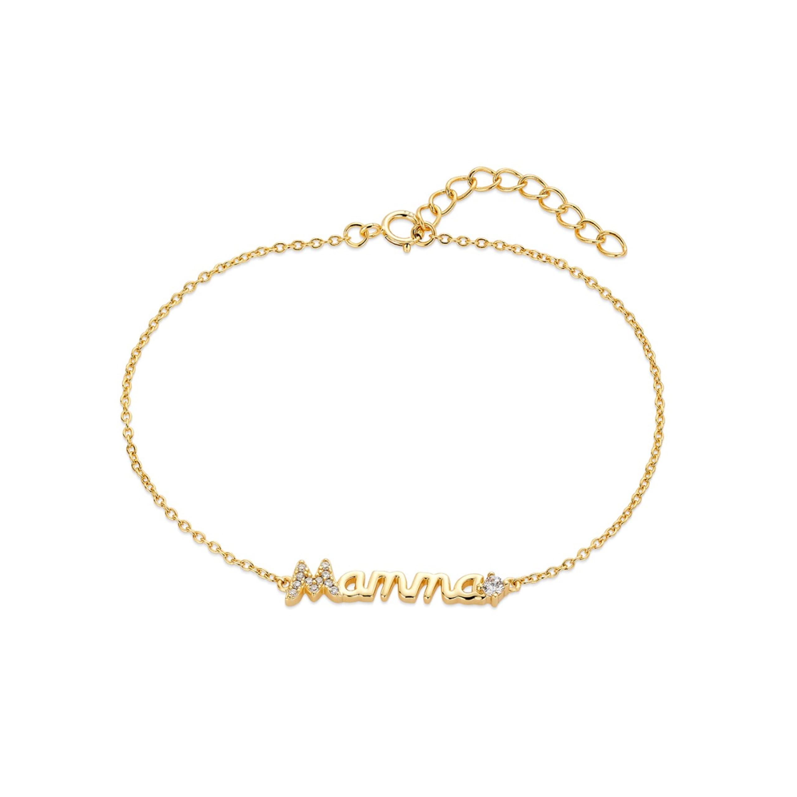 Dette armbåndet er den perfekte gaven til mamma. Armbåndet er laget i forgylt sølv med anheng som står MAMMA og pyntet med glitrende stener. Et utrolig vakkert armbånd som hun kommer til å elske og sette ekstra pris på.
