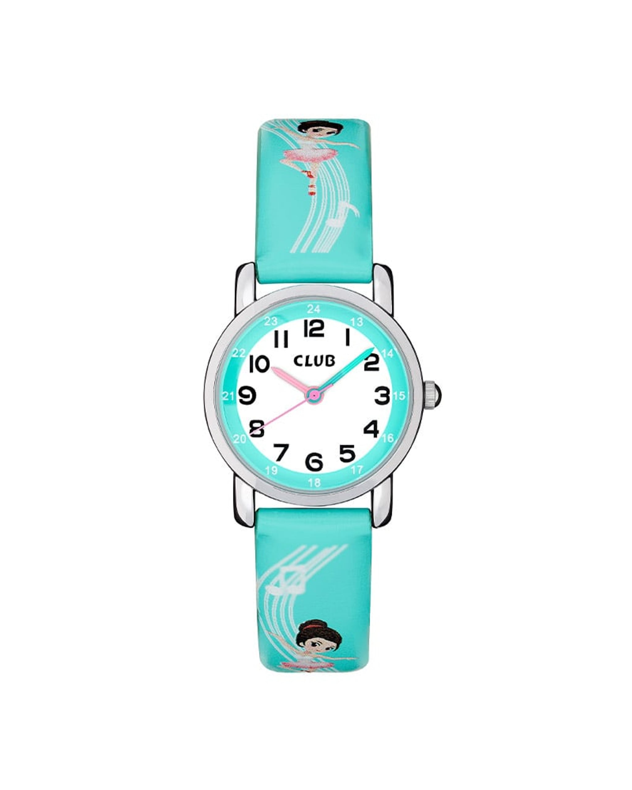 Utrolig søt barneklokke fra Club! Denne modellen kommer i turkis med ballerinamotiv på remmen og hvit urskive med turkisfargede detaljer. Tallindeksene er skrevet med arabiske tall fra 1-24, noe som gjør det enklere å lære seg klokken. Urkassen måler 27 mm og tåler kun lett vannsprut. Dette er en fin klokke å bruke til skolestart og en flott gave å gi til barn.