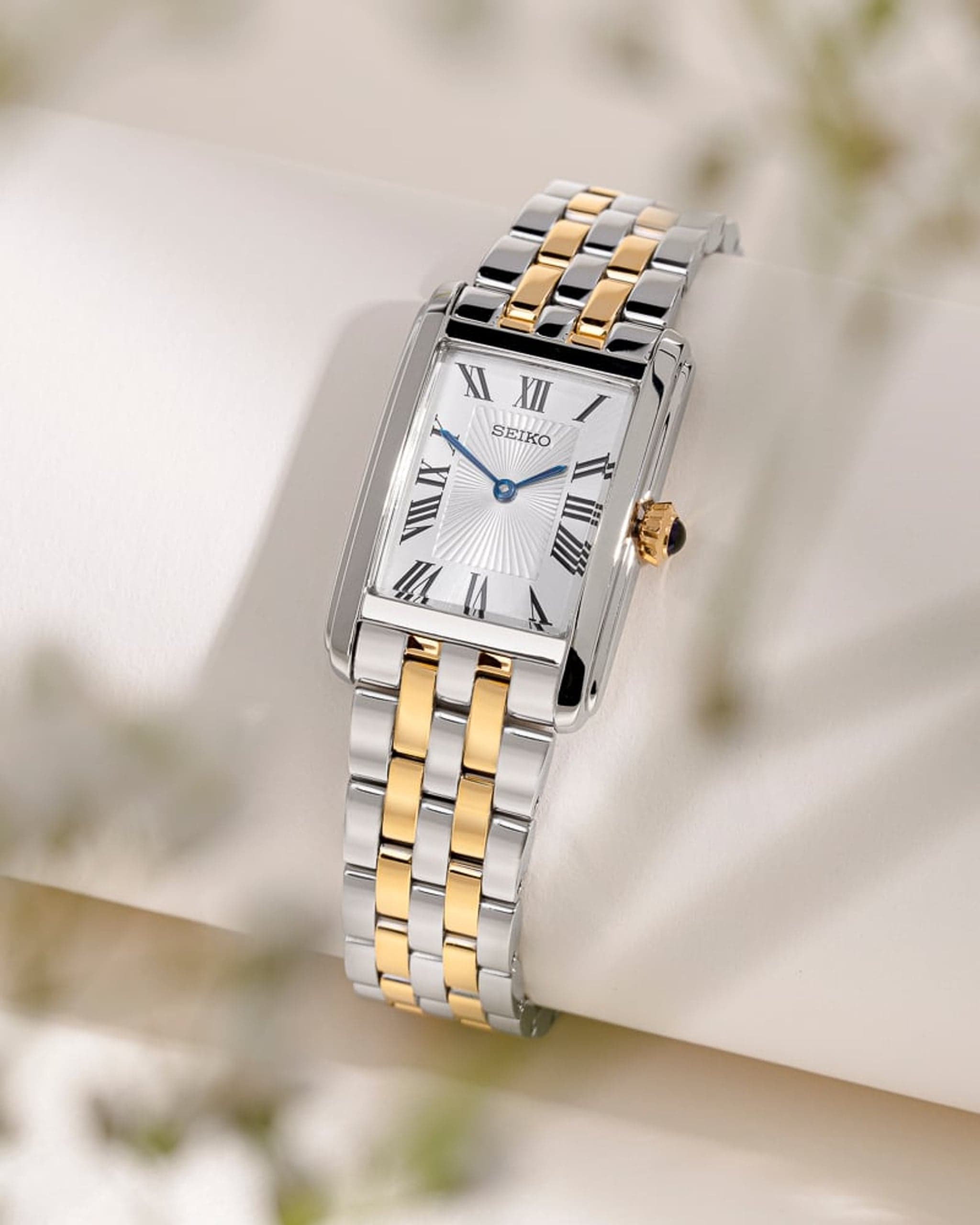 Elegant dameklokke fra Seiko Ladies med firkantet urkasse. Denne modellen kommer i tofarget stål. Lenken er tofarget med gull og sølv, kronen på siden er i gull med blå sten. Urkassen er i sølvfarget stål med romerske tallindekser og blå visere. Klokken tåler vannsprut som håndvask og regn.