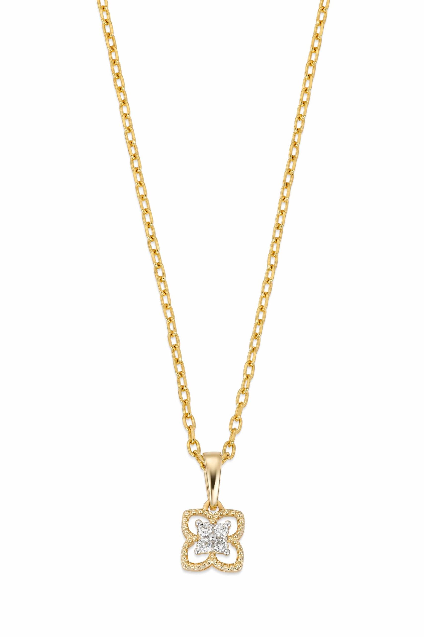 Et nydelig halssmykke fra House of Piene-kolleksjonen. En eksepsjonell smykkekolleksjon som henter inspirasjon fra vinterens dramatikk og renhet. Dette vakre halssmykket har et anheng utformet som en blomst med 4 glitrende diamanter og glattpolerte kanter, prydet med lekre detaljer. Kjedet som følger med er laget i forgylt sølv. Halssmykket passer like godt til hverdagsbruk som til spesielle anledninger. Det er fint å bruke alene eller sammen med matchende øredobber.