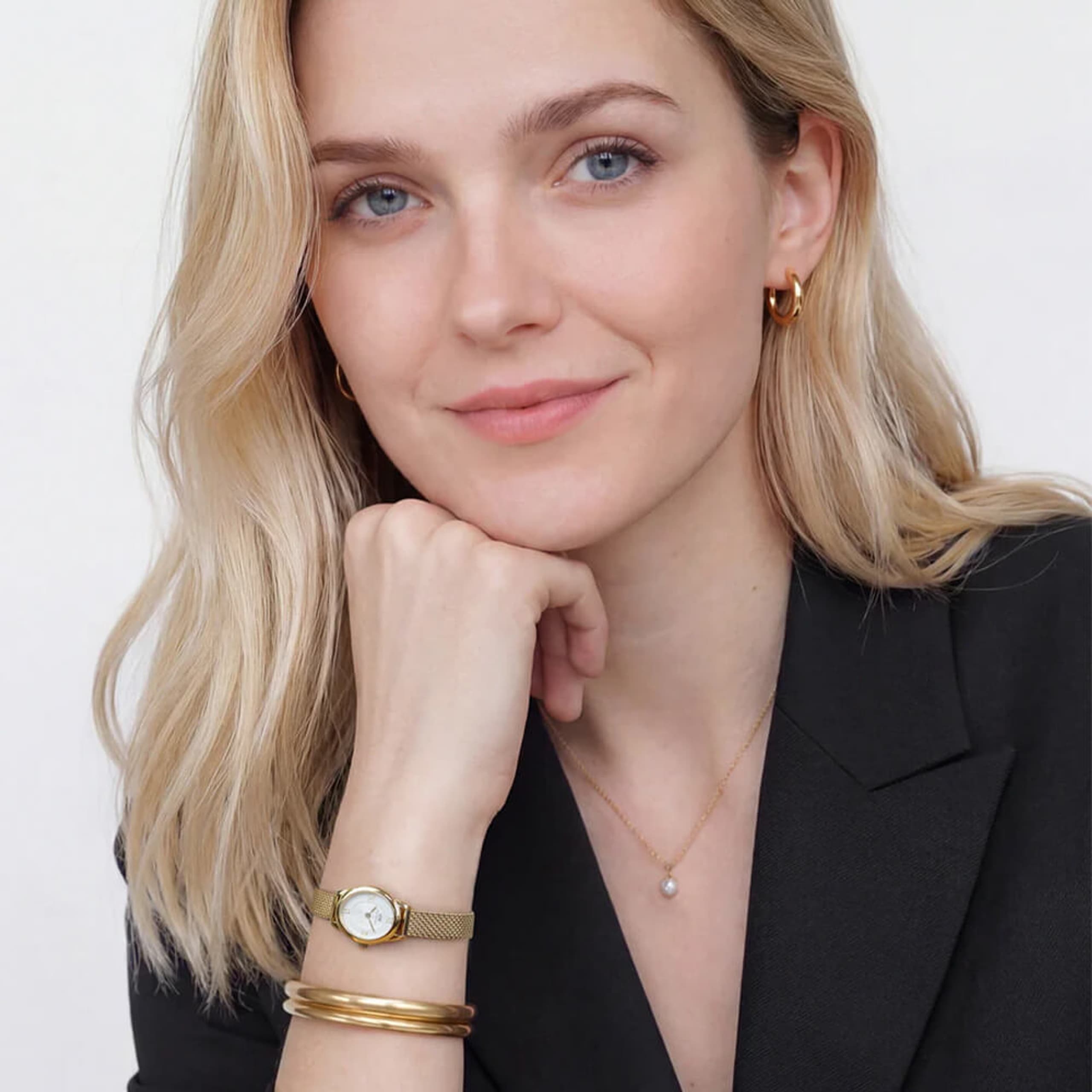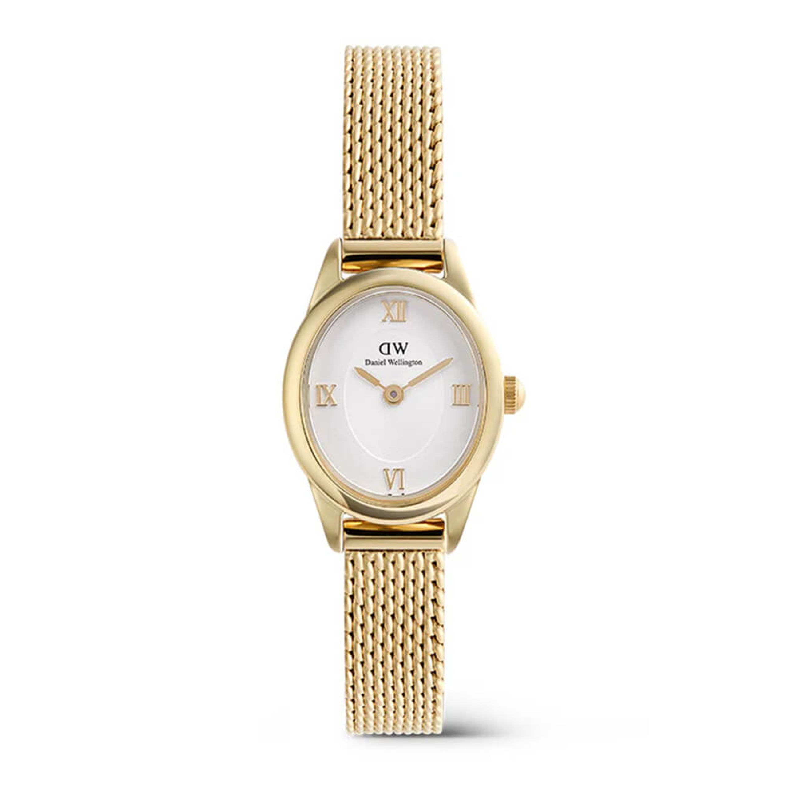 Ophelia Mini Mesh fra Daniel Wellington er en sofistikert og særpreget dameklokke i gullfarget stål. Den ovale urkassen på 22 mm kombineres med en hvit urskive og gullfargede, klassiske romertall, som gir et tidløst uttrykk. Den slanke meshremmen sitter behagelig på håndleddet og kan enkelt tilpasses for optimal passform. Klokken er sprutsikker og tåler vann ved for eksempel håndvask, men bør ikke utsettes for større mengder vann.