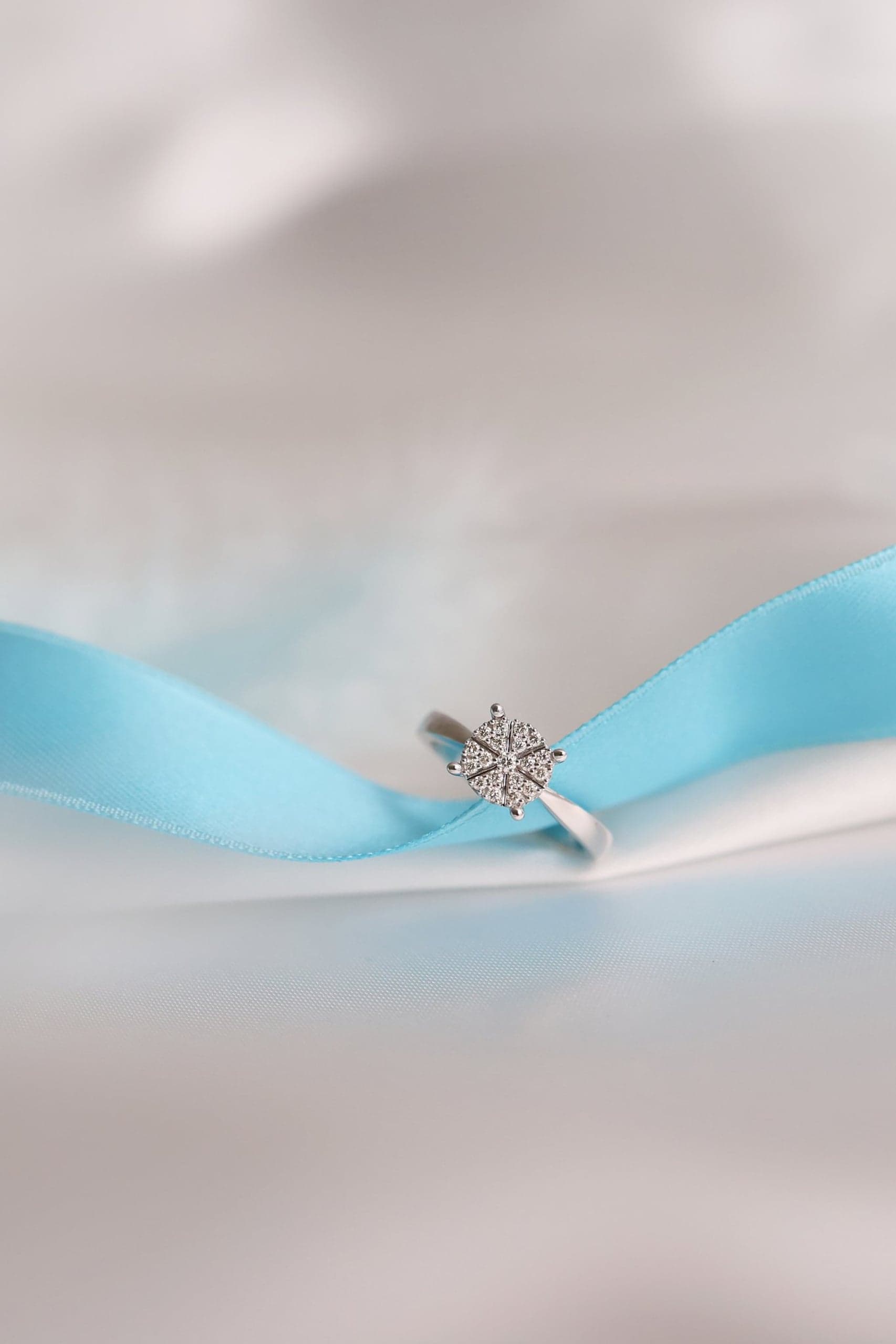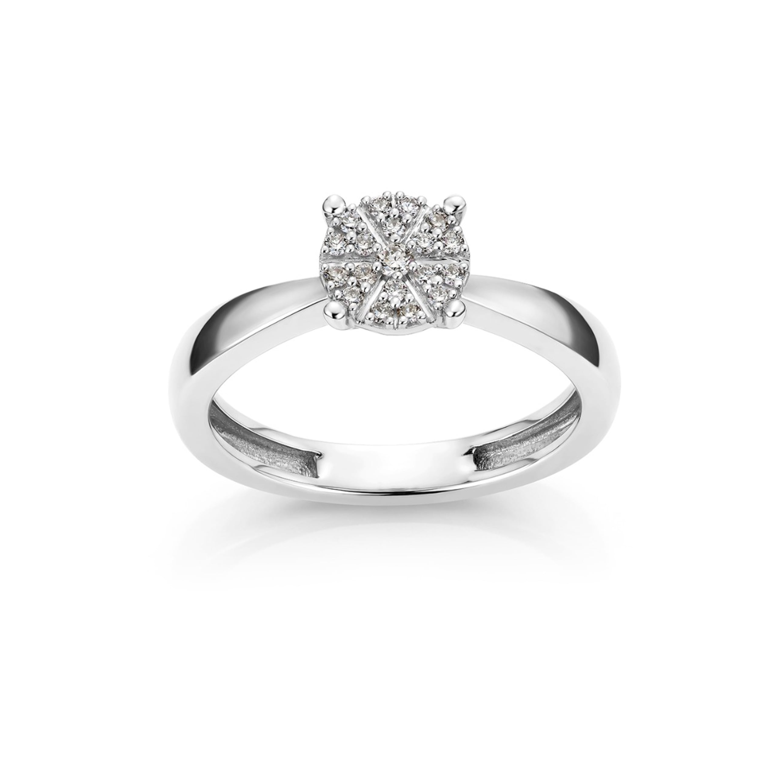 Denne vakre diamantringen har et nydelig design med 19 glitrende stener og total karat på 0,118 i W/P1-kvalitet. Ringen er flott alene og kan også brukes som en forlovelsesring. Det finnes matchende halssmykke og øredobber for det perfekte smykkesettet.