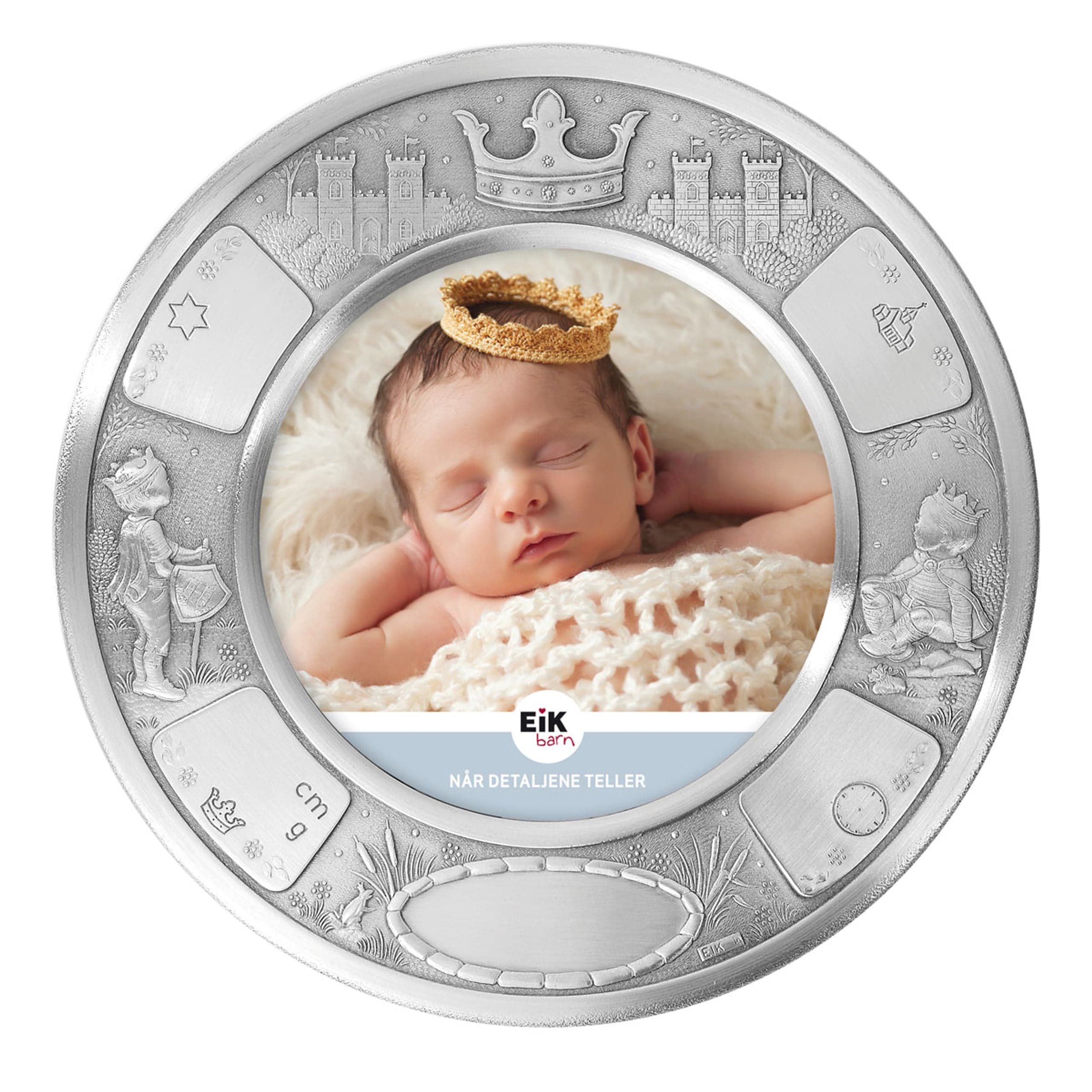 En nydelig og tidløs dåpsramme i tinn fra Eik Barn – perfekt som gave til en helt spesiell anledning. Rammen har et detaljrikt og eventyrlig design med små motiver som symboliserer barndom, trygghet og gode minner. Øverst prydes rammen av en krone, som gir et ekstra hint av noe kongelig og unikt.
