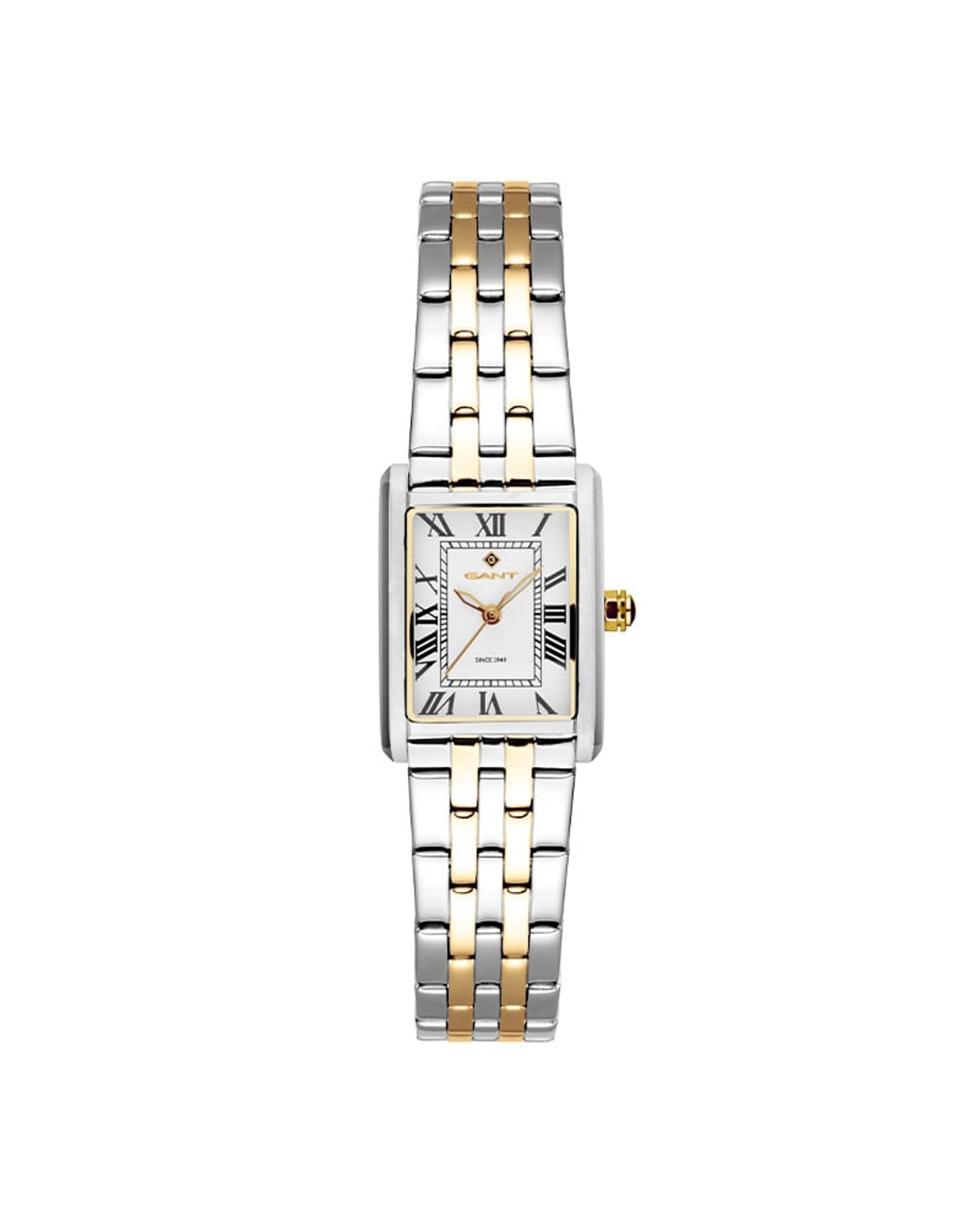 En tidløs og sofistikert dameklokke fra Gant, med firkantet urkasse og tofarget stål i gull og sølv. Rhode Island Mini har et tidløst design med sølvfarget urskive, prydet med gullfargede visere og romerske tallindekser. En allsidig klokke som passer perfekt både i hverdagen og når du skal pynte deg litt ekstra.
