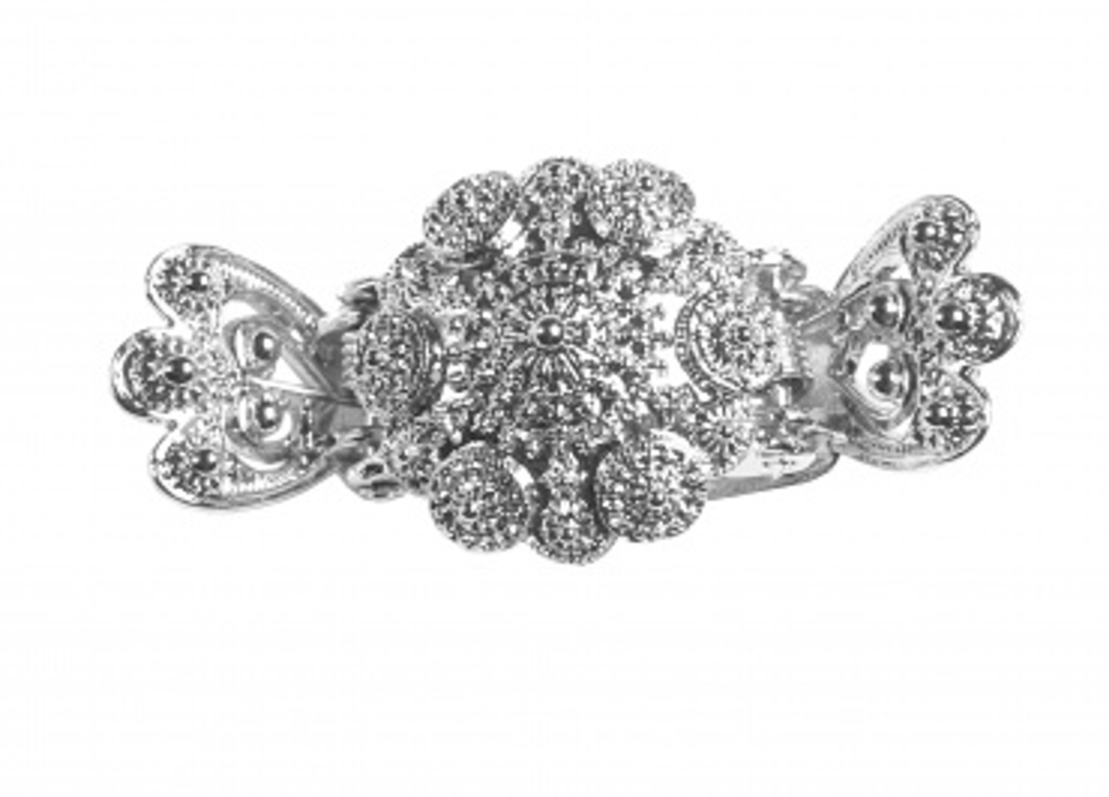 Knapp i sølv. Vi har knapper i mange varianter. Fra de enkleste "fanteknappene" til de mer detaljerte hollandsknappene. Leveres som par. i midten. Endene på klypen til håret er formet som et hjerte. Design Noma.