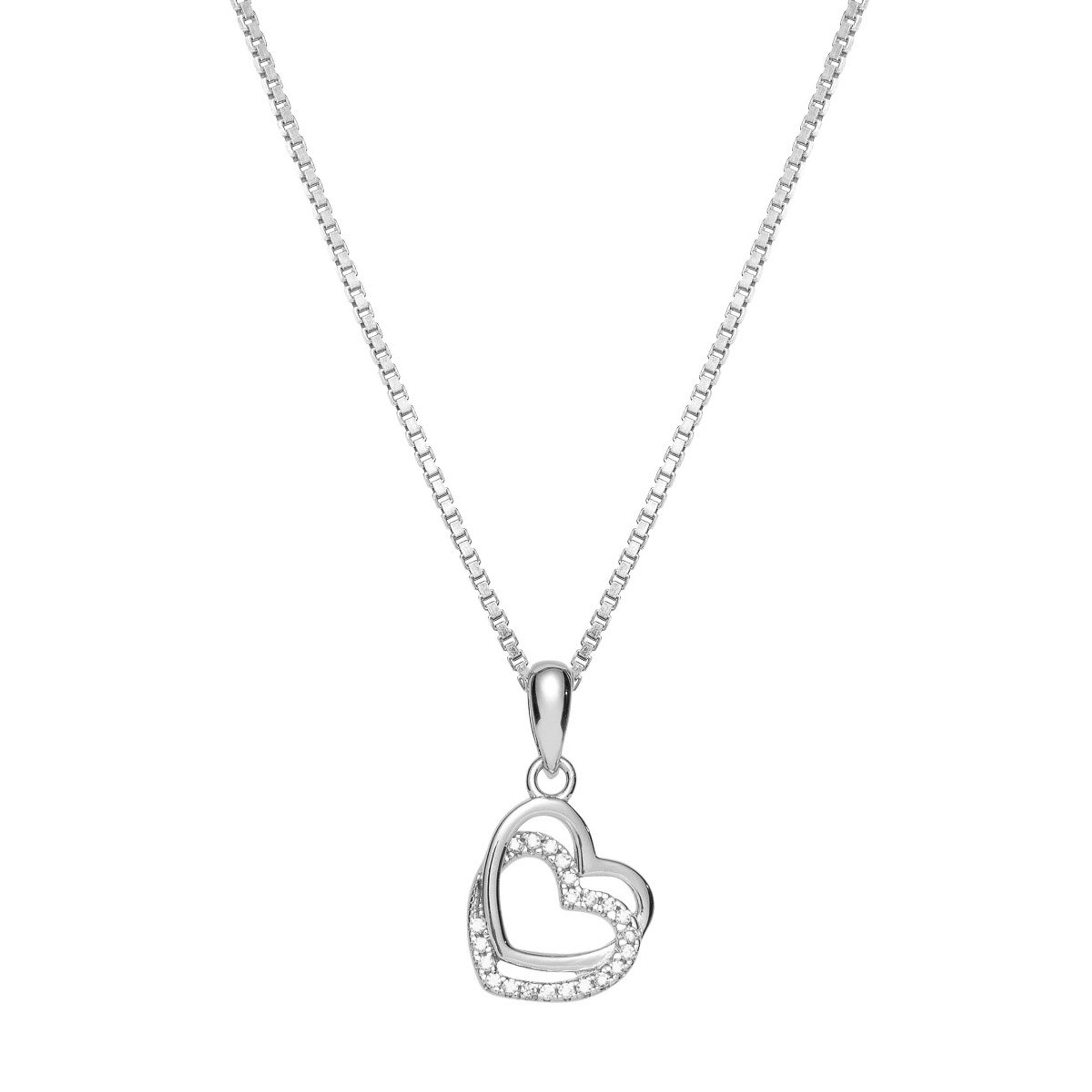 Et vakkert halssmykke i sølv med et anheng av hjerter. Disse to hjertene er overlappet sammen, hvor det ene hjertet er også prydet med glitrende stener. Smykket er et nydelig symbol på kjærlighet eller vennskap mellom to mennesker. Dette er en fantastisk gave til en du er utrolig glad i.
