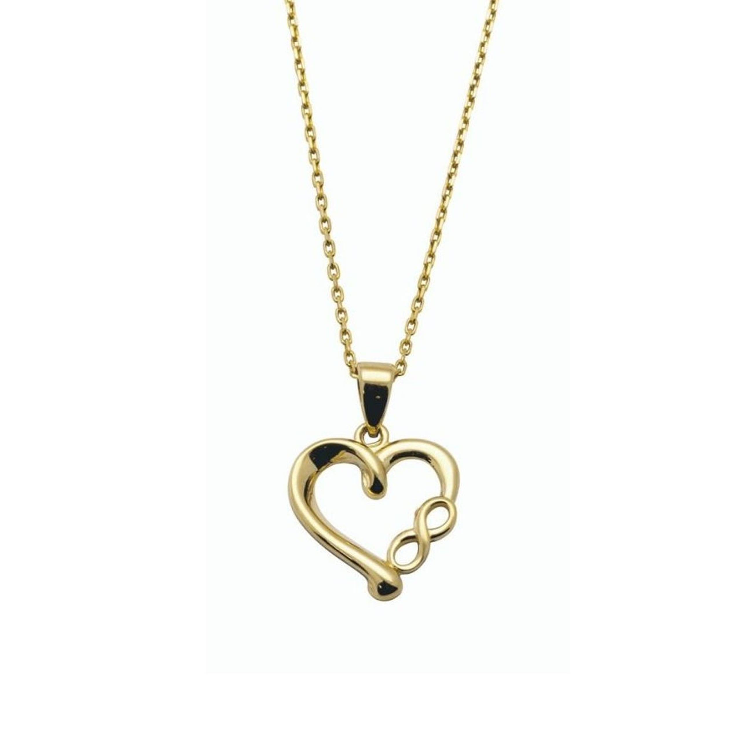 Dette vakre halssmykket har et hjerteformet anheng med et elegant innfelt evighetstegn. Dette er en fin kjærlighetsgave å gi til en du er utrolig glad i, om det er til mor, kona, kjæresten eller venninne. Kjedet som følger med er laget i forgylt sølv.