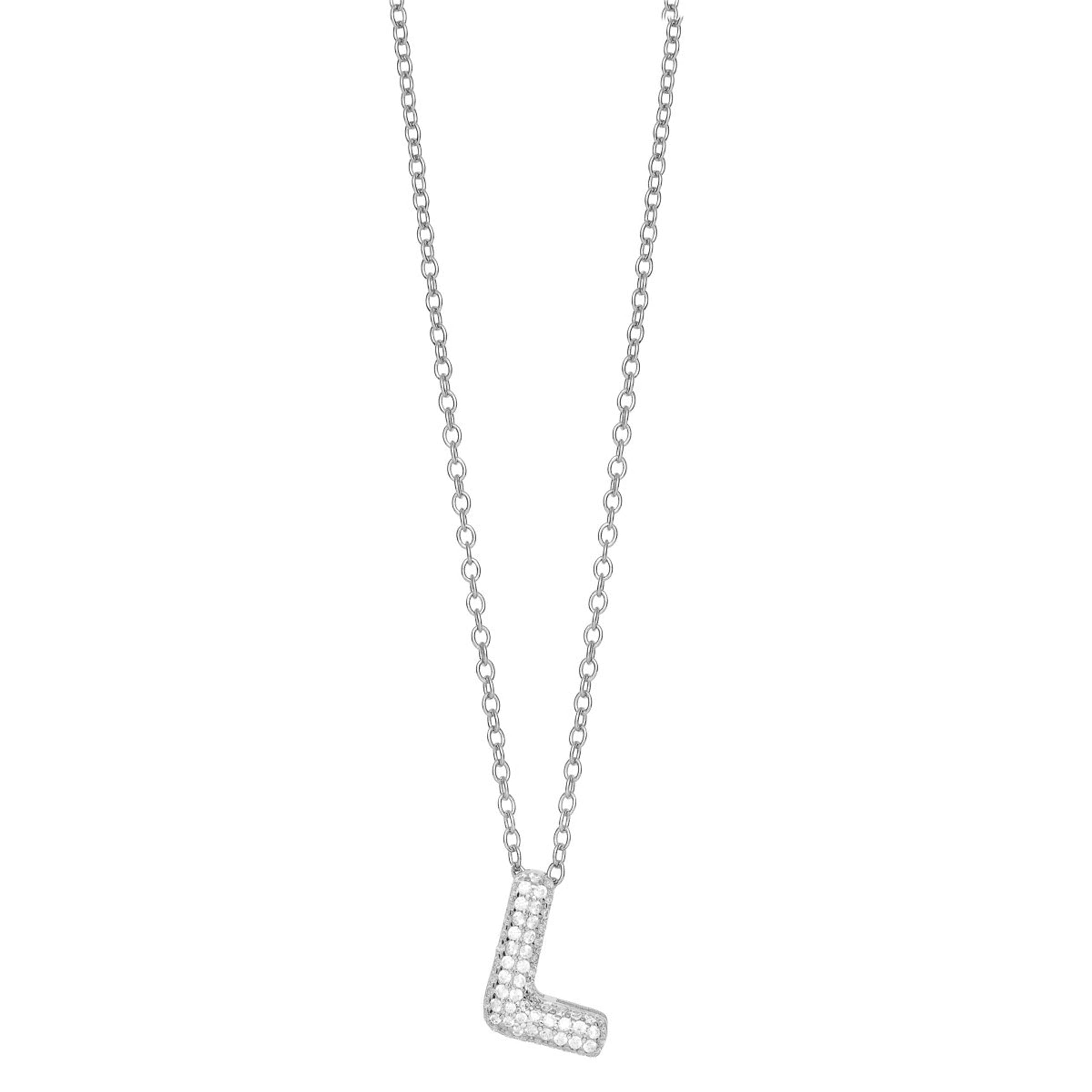 Stilfullt halssmykke i rhodinert sølv med bokstav L. Anhenget er prydet med cubic zirkonia stener som gir et elegant og glitrende uttrykk. Smykket leveres med et kjede på 43 cm. Et personlig og trendy smykke som gir antrekket det lille ekstra, og en flott gave til en du er glad i.
