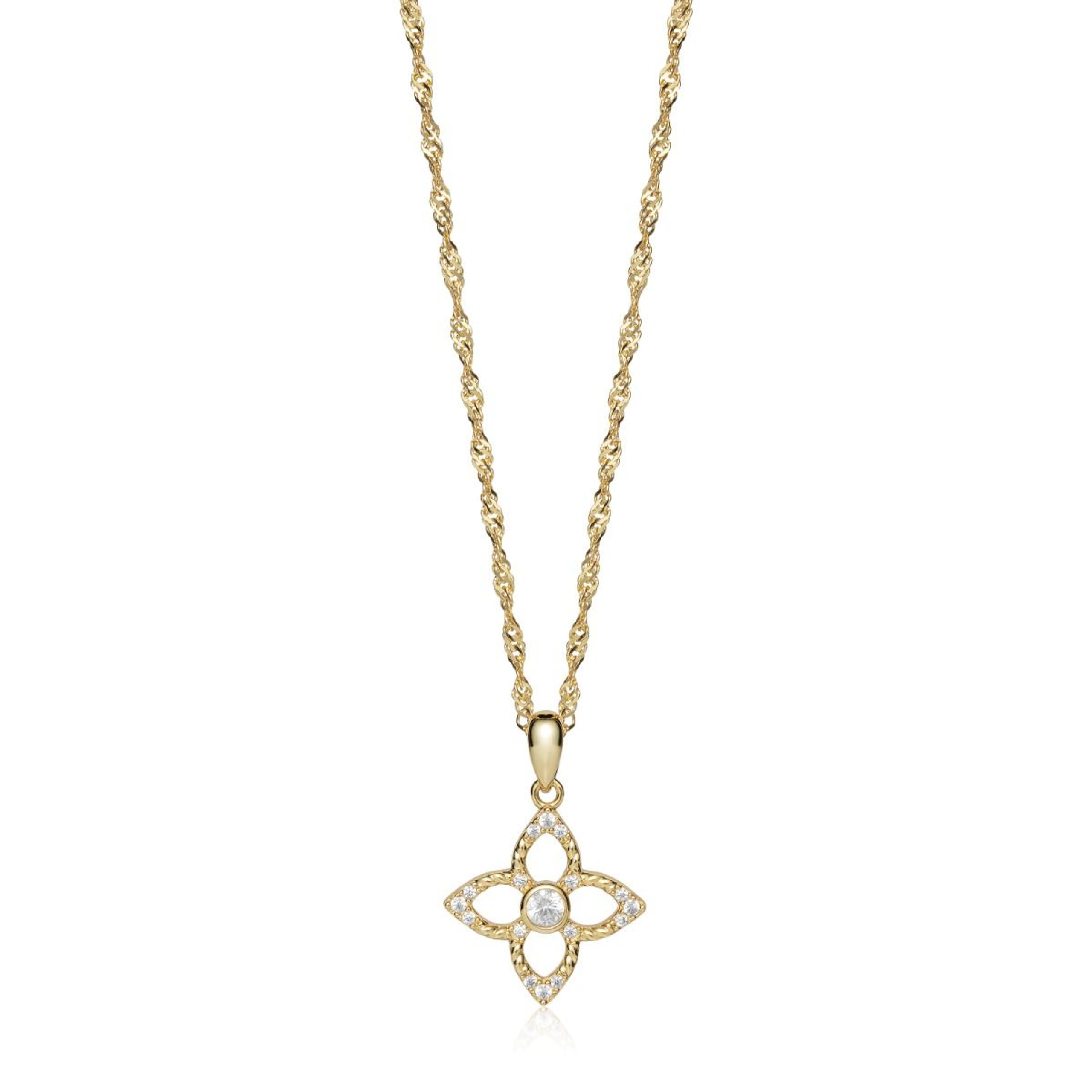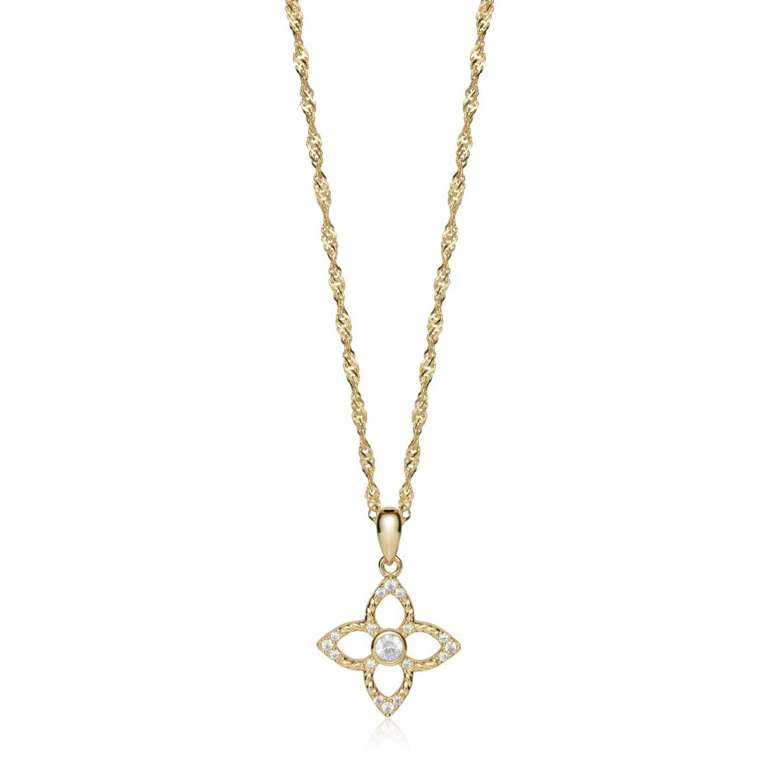 Et vakkert halssmykke i forgylt sølv. Anhenget er formet som en blomst med fire blader, dekorert med glitrende stener. Det henger på et lekkert singaporekjede som er justerbart. Smykket er en fantastisk gave til spesielle anledninger hvor det vil ha en spesiell betydning. Halssmykket er fint å bruke alene, eller sammen med matchende øreringer.