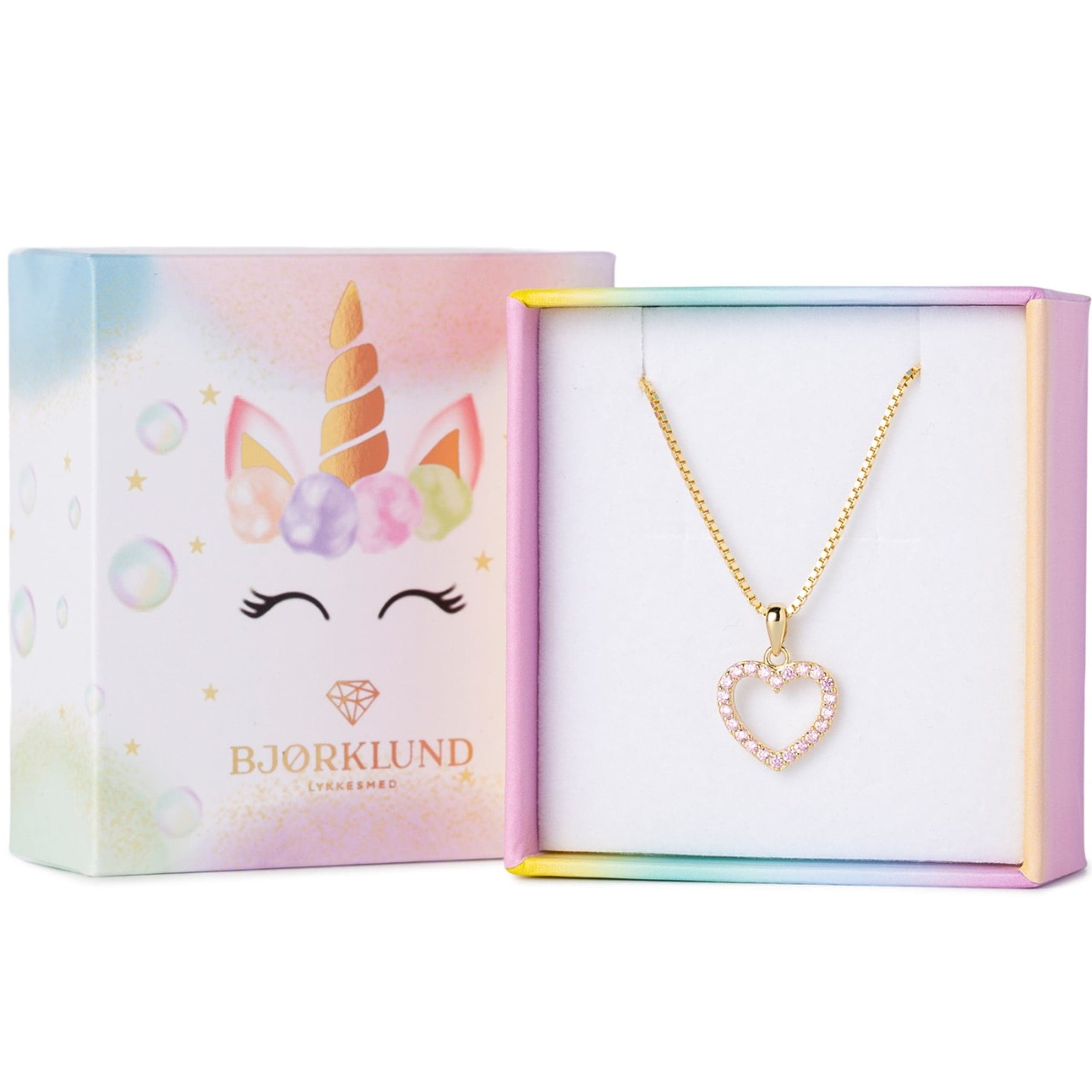 Nydelig halssmykke til barn med hjerte. Dette fine hjerteanhenget er laget med 14 karat forgylling og besatt med rosa cubic zirkonia stener. Kjedet som følger med er laget i 925 forgylt sølv i en lengde på 38 cm.