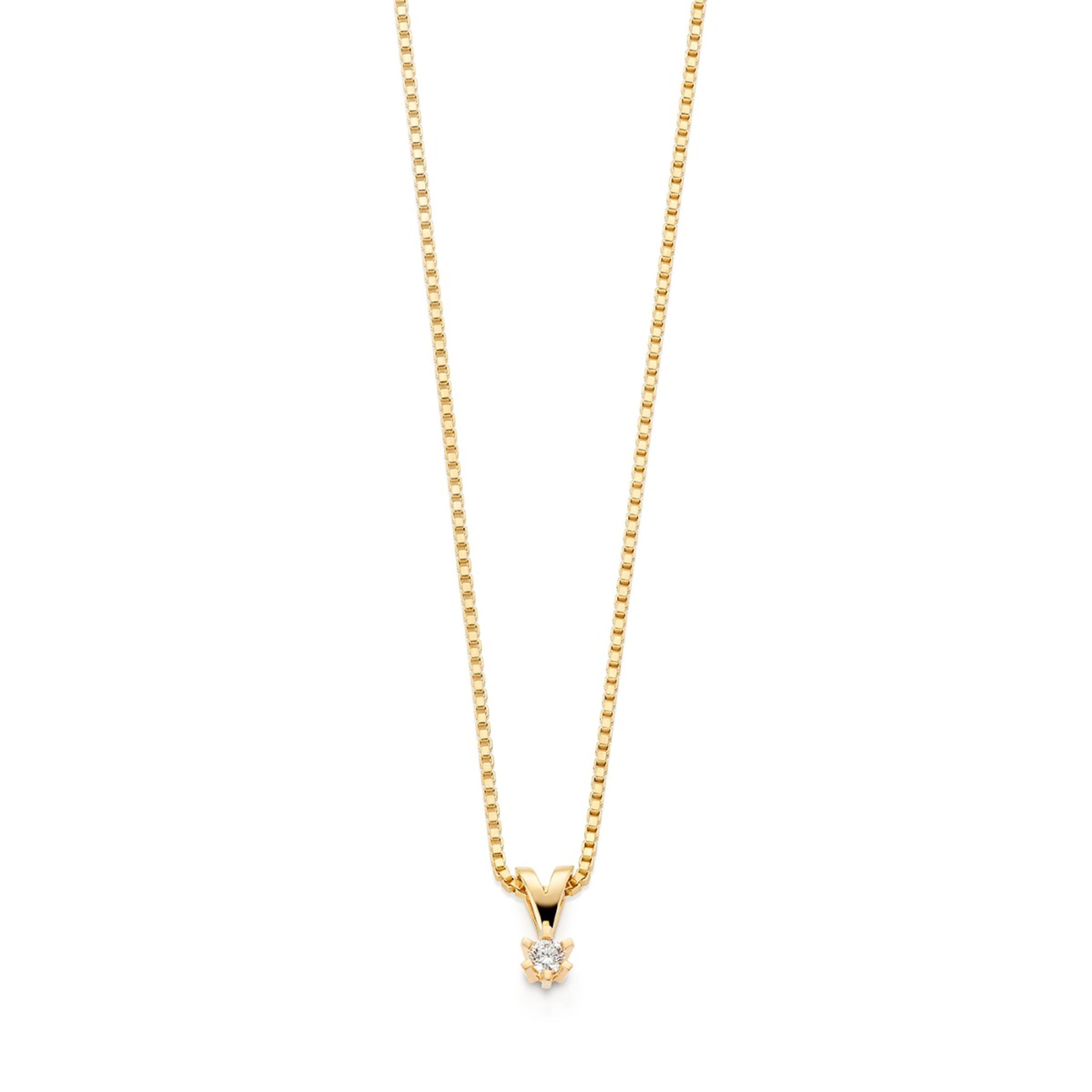 Nydelig diamantsmykke i 14 karat/585 gult gull. Diamanten har en rund brilliant slip og har en totalvekt på 0,05ct i W/SI. Det følger med et forgylt kjede i 925 sølv. Halssmykket er fint til hverdagen som til fest og er en fin gave som hun kommer til å elske! Kjede 42 cm medfølger.