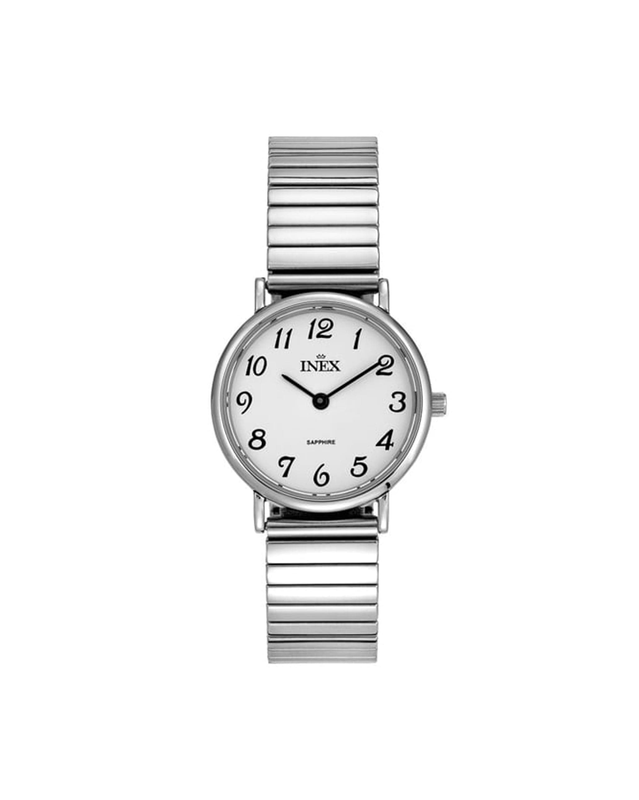 Stilren dameklokke fra INEX! Denne flotte og enkle klokken har lenke og urkasse i rustfritt stål. Hvit urskive med sorte timemarkører og visere. 30m vanntett (vannresistent). Safirglass. Quartz urverk med 2 års garanti.
