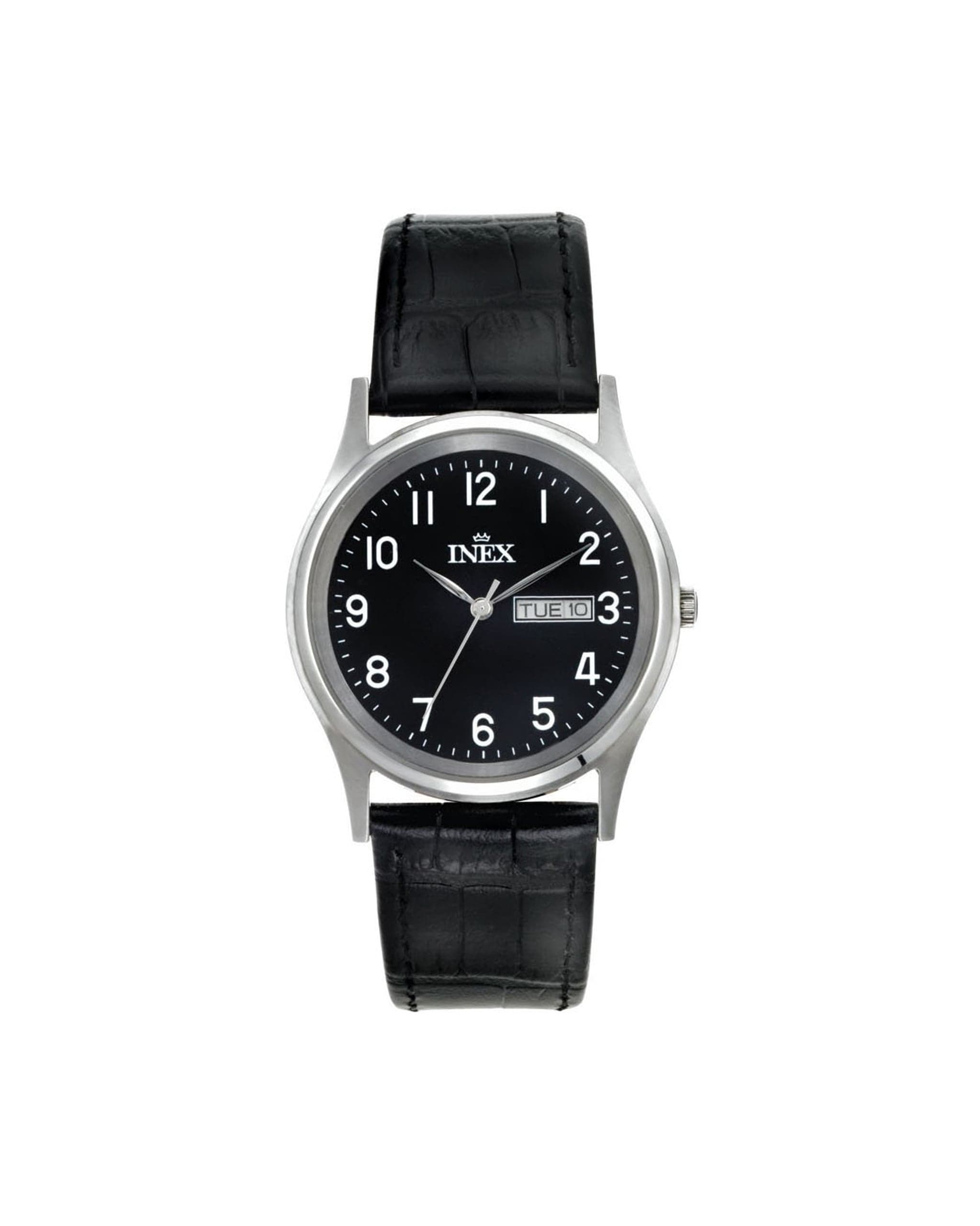Populær klokke med dag- og datovisning fra INEX! Denne modellen har sort lærreim, og urkasse i rustfritt stål. Sort urskive med hvite timemarkører og visere, samt dag- og datovisning i sort og rødt. 30m vanntetthet. Mineralglass. Quartz urverk med 2 års garanti.