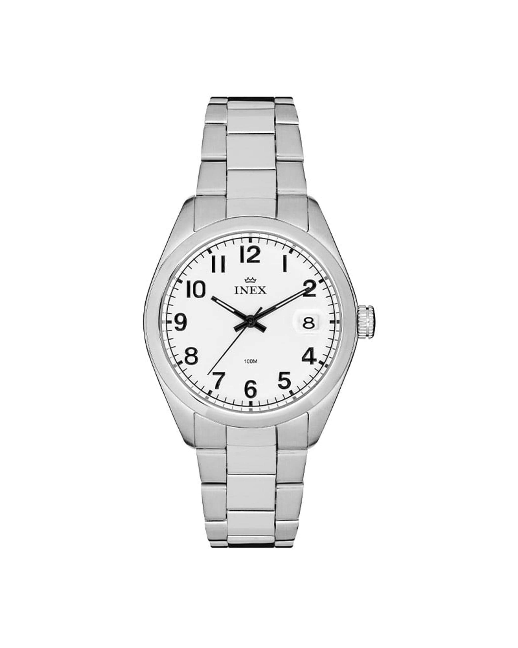 En klassisk og stilren herreklokke fra Inex laget i stål. Den hvite urskiven gir et tidløst uttrykk med sorte arabiske tallindekser og visere, som gjør det lett å lese tiden, og er beskyttet med mineralglass. Klokken har datovisning plassert ved klokken 3, med forstørrelsesglass for enkel avlesning av datoen. Klokken tåler godt med vann, men anbefales ikke å bruke til dypdykking som snorkling. Dette er en klokke som er like fin å bruke til hverdagen som til festlige anledninger.