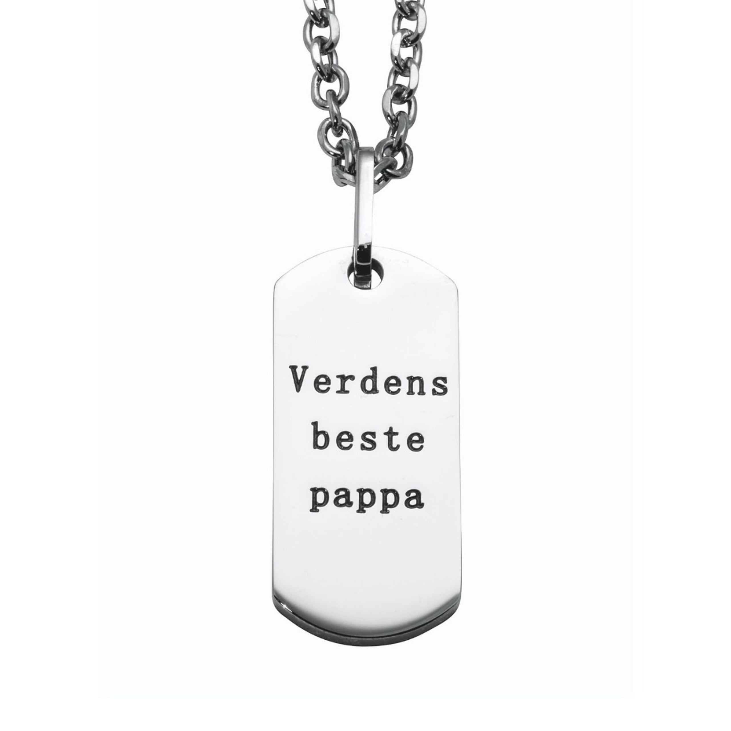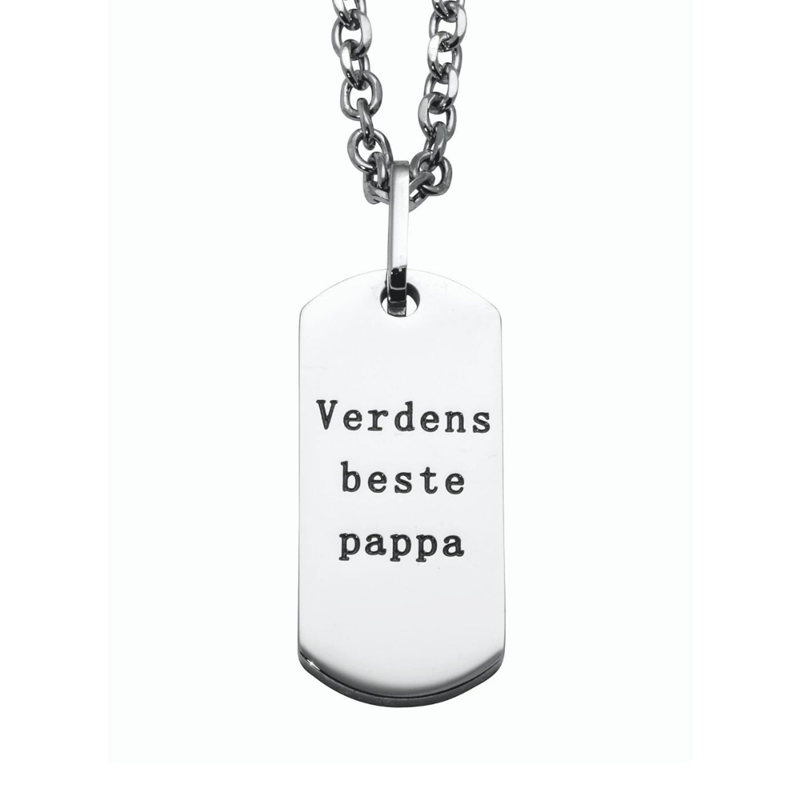 Dette halssmykket er den perfekte gaven til alle fedrene. En enkel plate med gravering hvor det står "Verdens Beste Pappa". Dette er et flott smykke som han kommer til å elske.