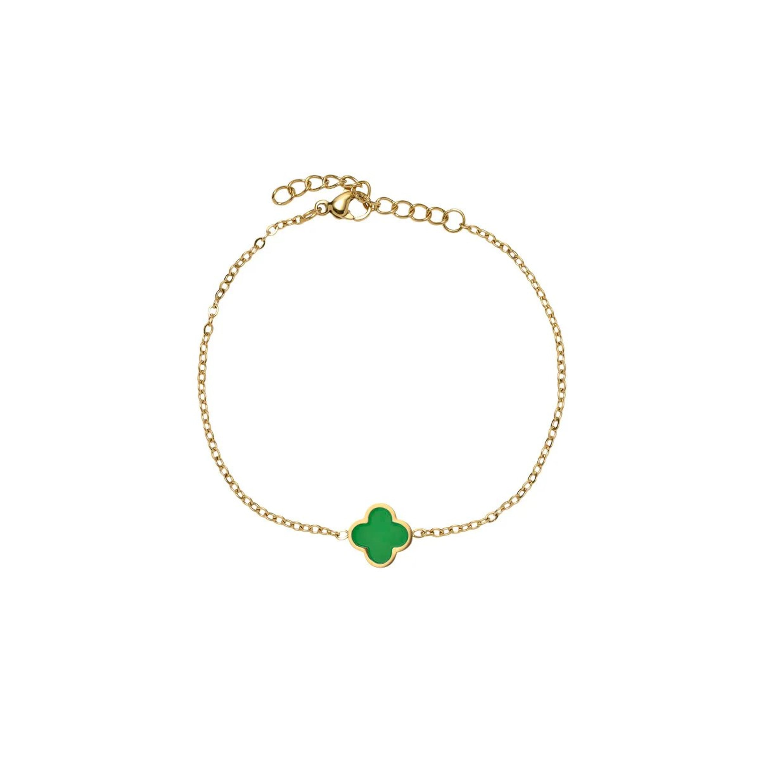 MERETE er et lekkert armbånd med flott dekor i grønn og formet som kløver. Med stilig design og trendy utseende er dette armbåndet perfekt for de som ønsker å følge med de nyeste trendene innen smykker. Armbåndet kan matches med tilhørende smykker som øreringer og halssmykke for komplett sett. Armbåndet er også fint sammen med klokker og andre smykker.