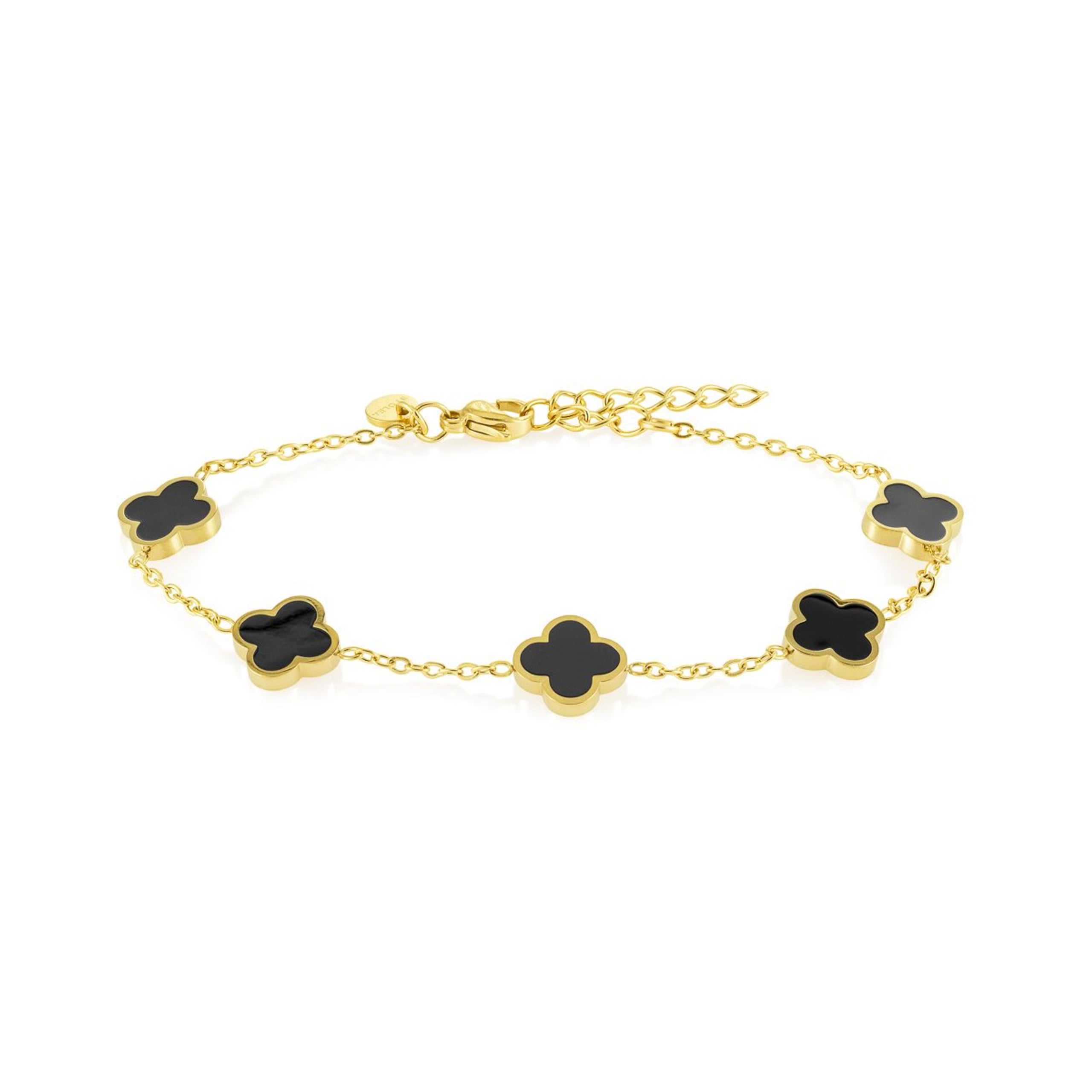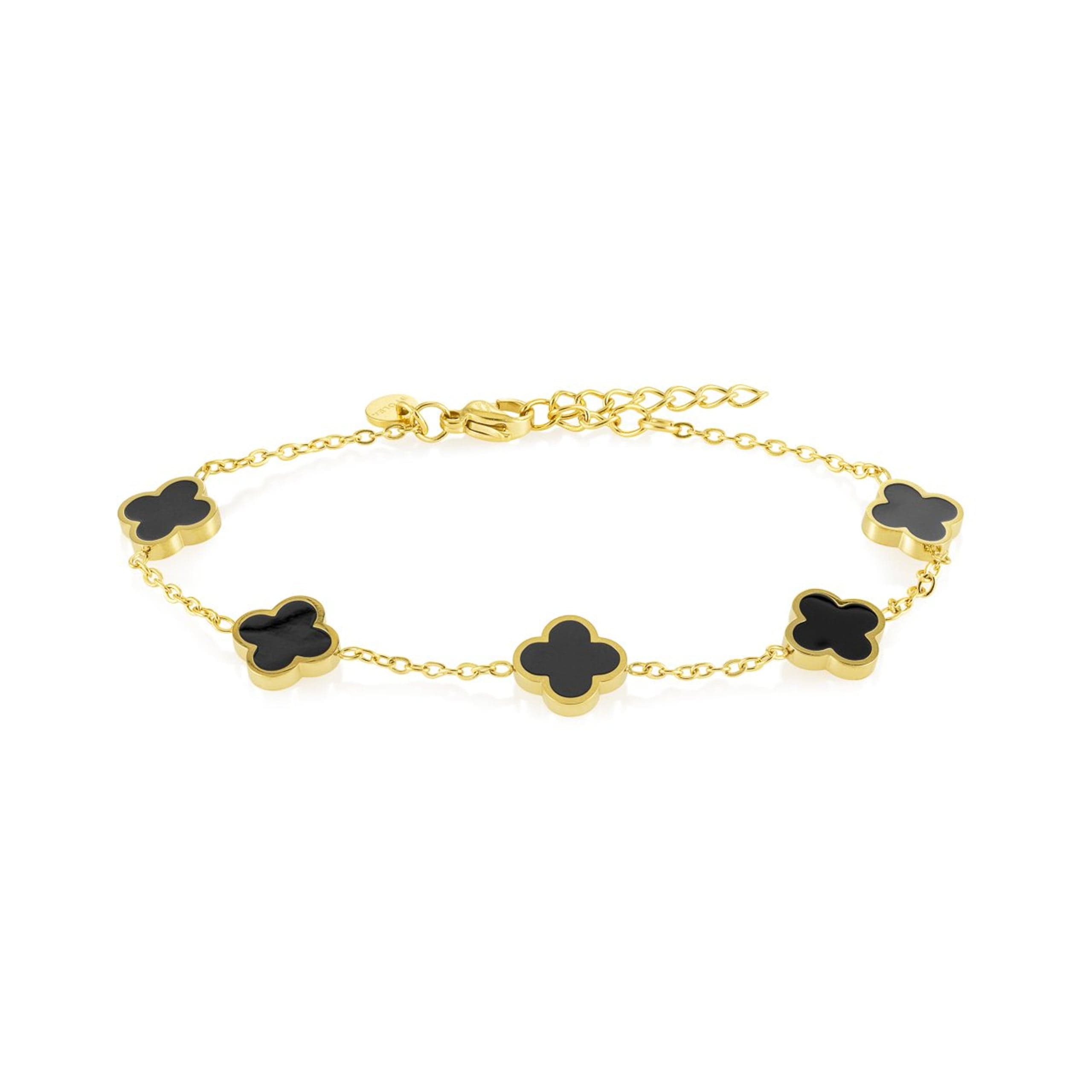 Merete er et lekkert armbånd med fem kløverdekorer i sort. Med stilig design og trendy utseende er dette armbåndet perfekt for de som ønsker å følge med de nyeste trendene innen smykker. Armbåndet kan matches med tilhørende smykker som øreringer og halssmykke for komplett sett. Armbåndet er også fint sammen med klokker og andre smykker.