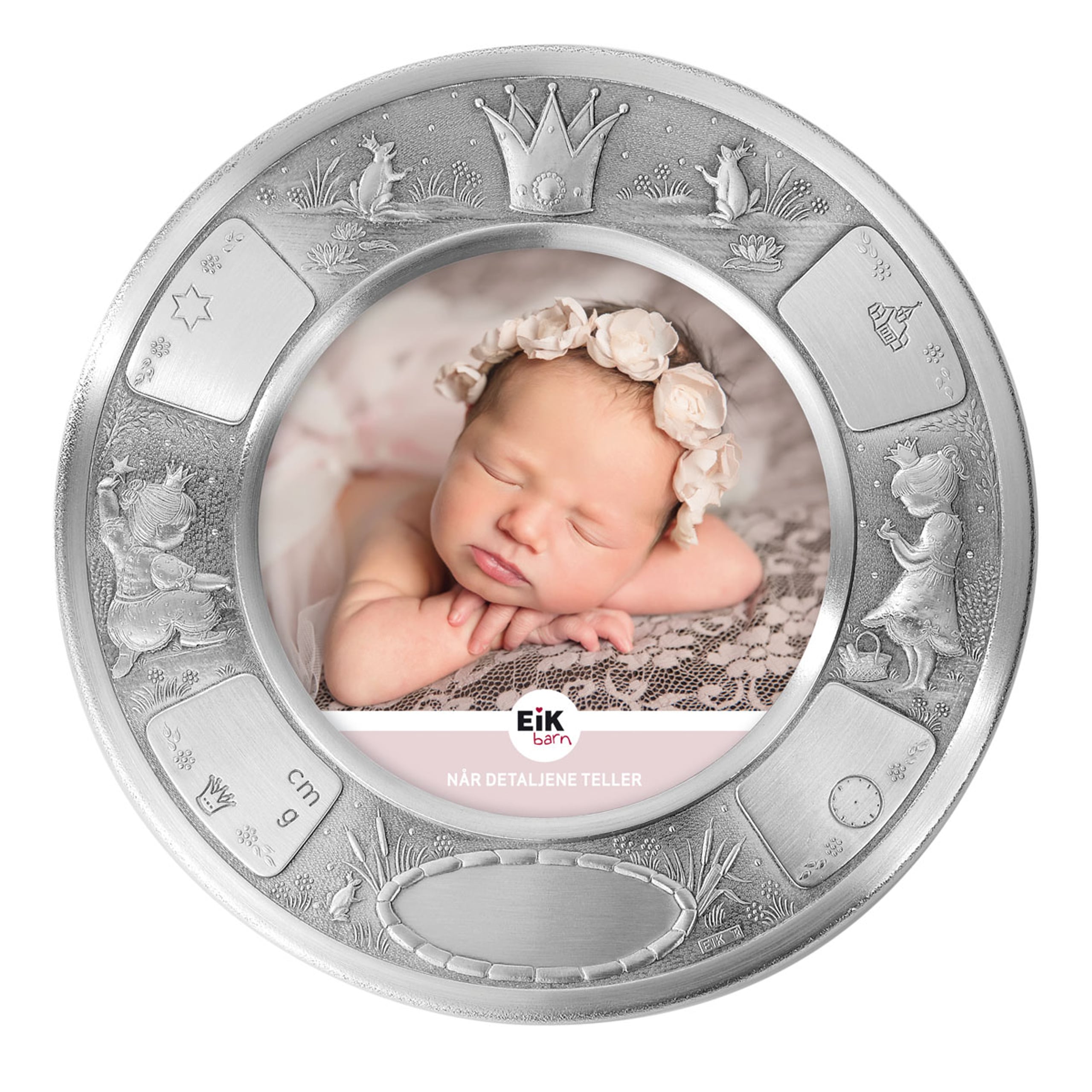 Midt i rammen er det plass til et vakkert bilde av barnet, og rundt rammen finner du felter som kan graveres med navn og alle fødsels- og dåpsdata.