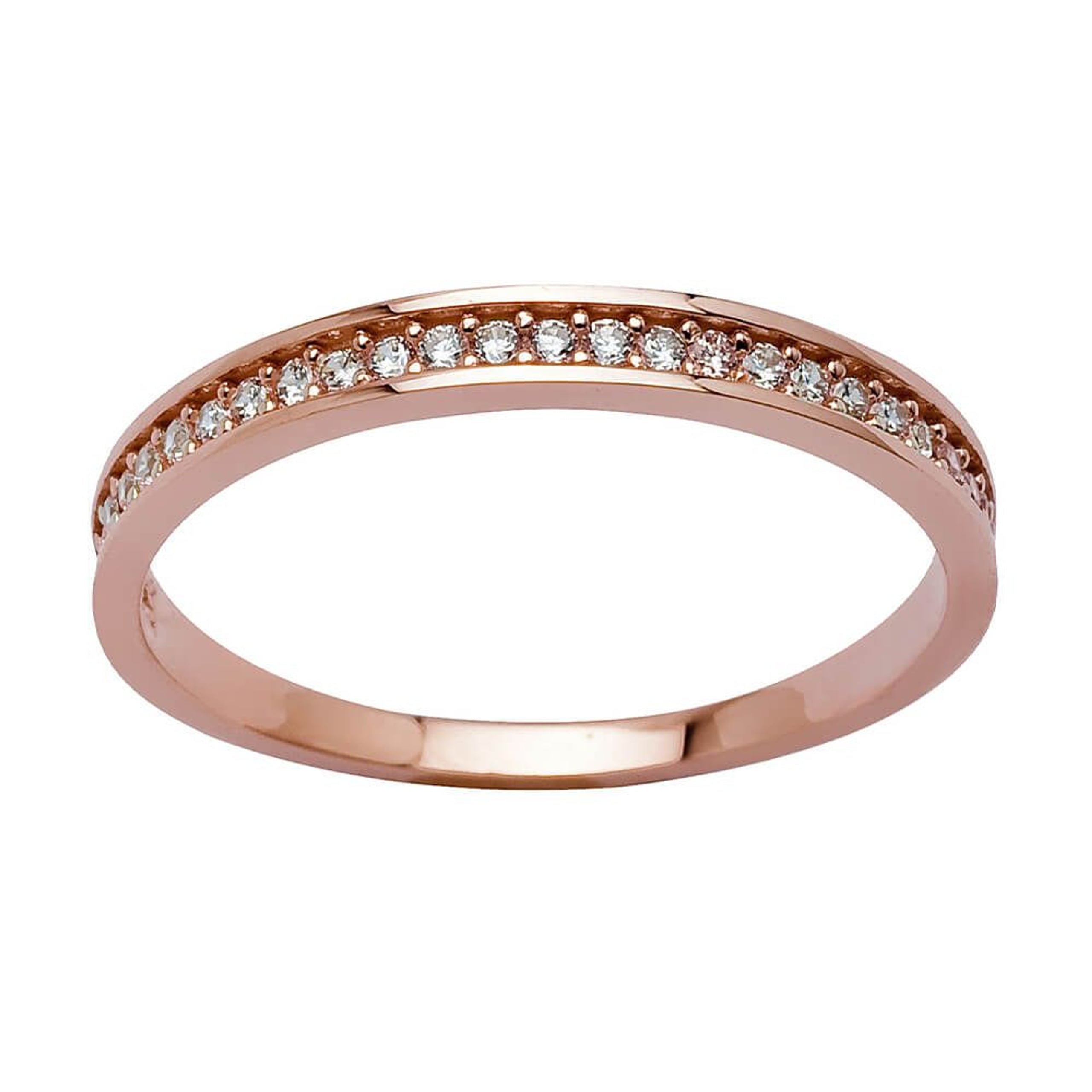 Elegant ring i rosegull, dekorert med én rad glitrende cubic zirkonia. Ringen har et stilrent design som gir et eksklusivt uttrykk, og kan enkelt kombineres med andre ringer for et personlig og moderne look.