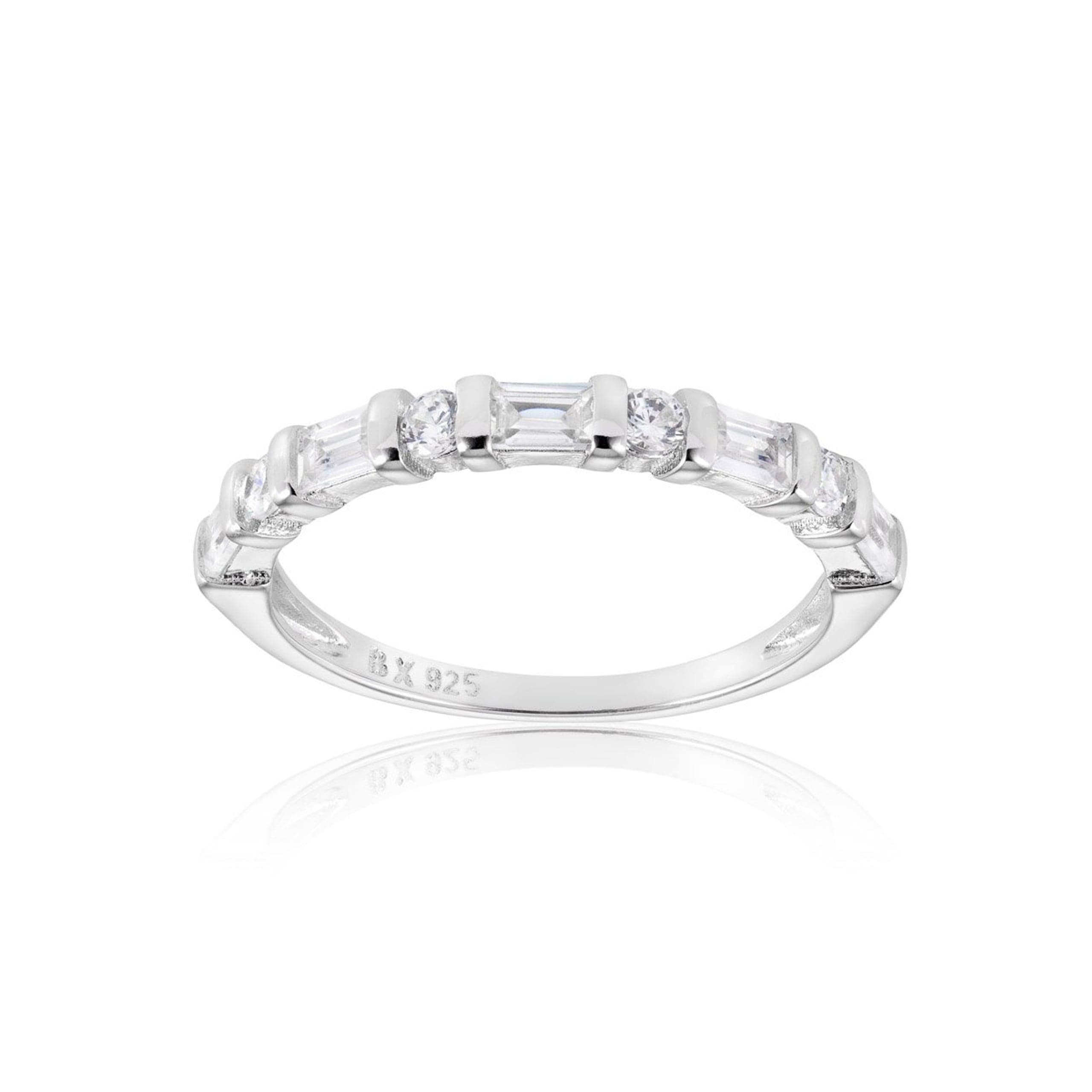 Denne vakre ringen er laget i 925 sølv med rhodinert overflate og prydet med glitrende cubic zirkonia stener i ulike slip, inkludert baguetteslip kombinert med mindre stener. Dette gir ringen et spennende og elegant uttrykk. Den er vakker alene, men også perfekt å kombinere med andre ringer for å skape en personlig lag-på-lag-stil.