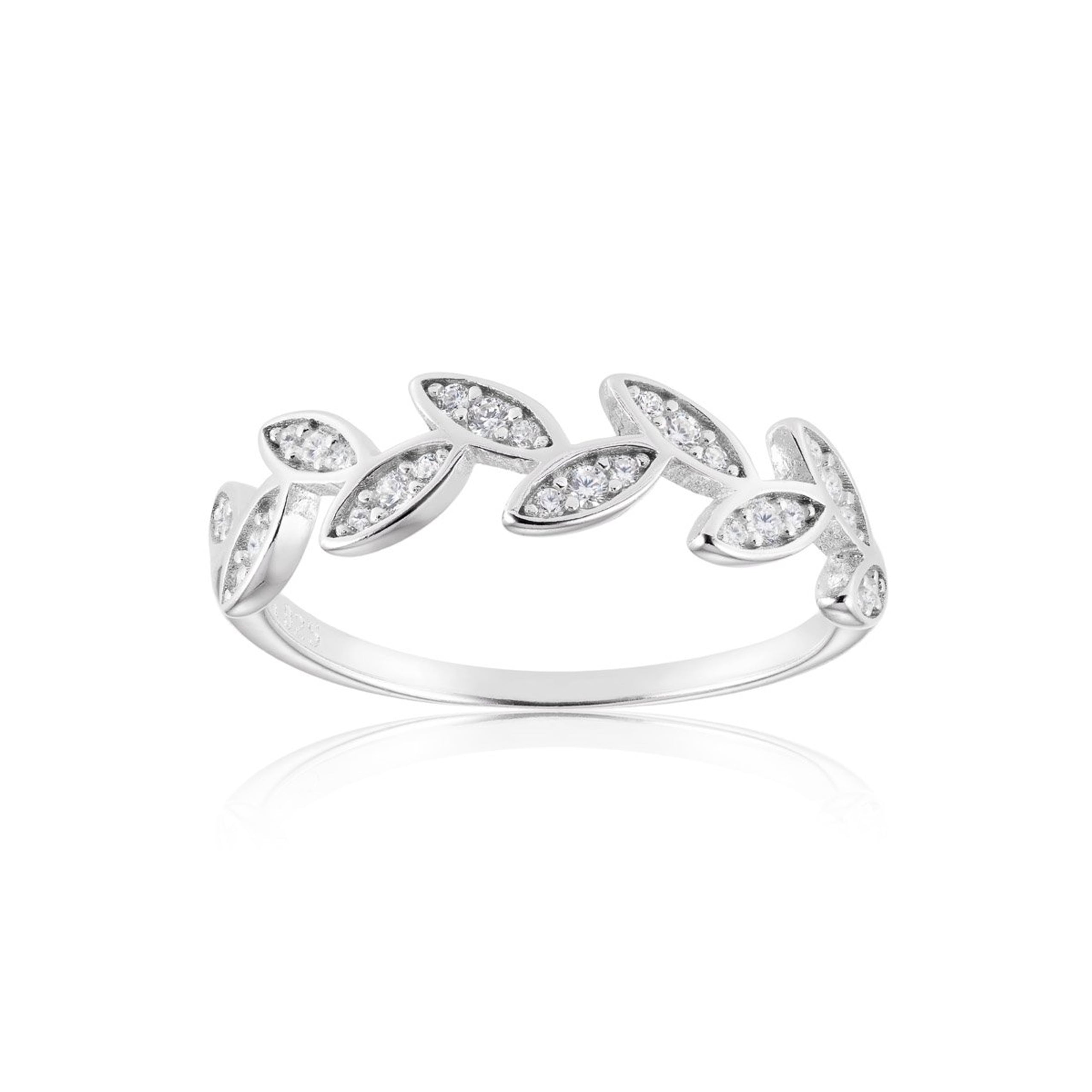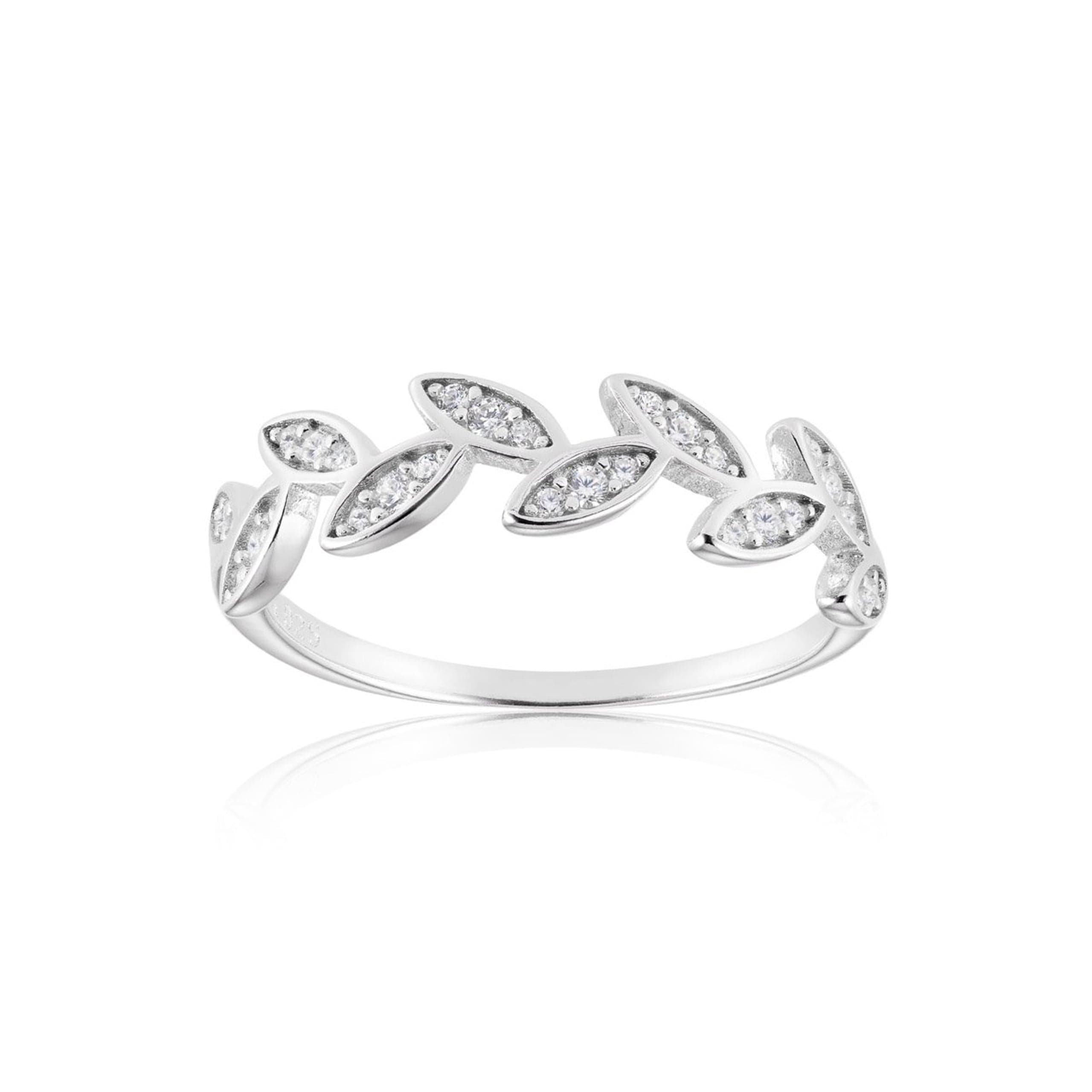 Denne lekre ringen er laget i 925 sølv med rhodinert overflate og har et elegant bladmotiv dekorert med glitrende cubic zirkonia stener. Den gir et stilfullt og delikat uttrykk, og gjør seg like fint alene som sammen med andre ringer for å skape en personlig lag-på-lag-stil.