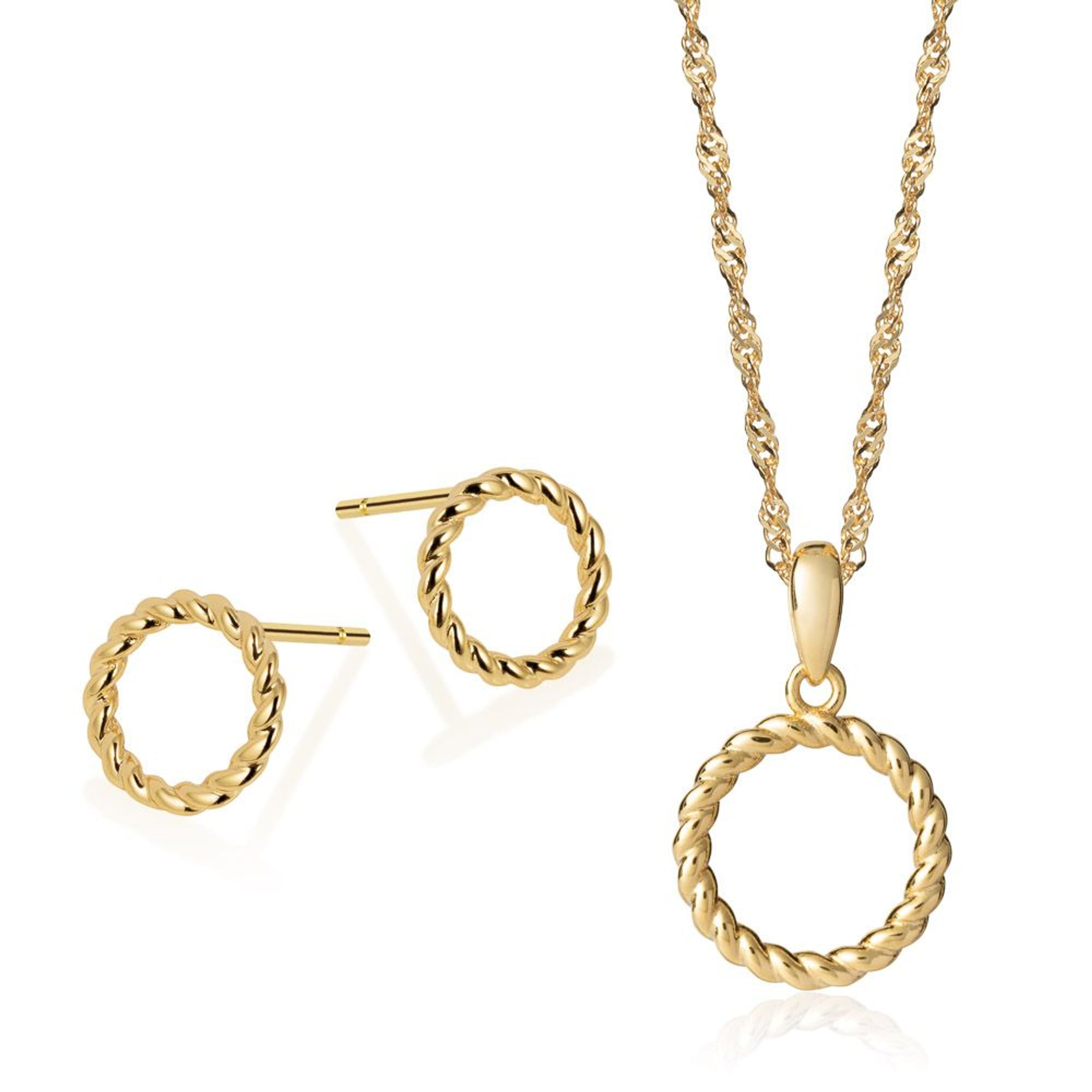Et elegant smykkesett bestående av halssmykke og øredobber. Designet har en vakker kransform, med sirkelformede øredobber og et anheng med et delikat tvinnet mønster. Dette er et tidløst og minimalistisk sett som passer like godt til hverdags som til fest, og gir antrekket ditt et sofistikert preg. En flott gaveidé til spesielle anledninger.