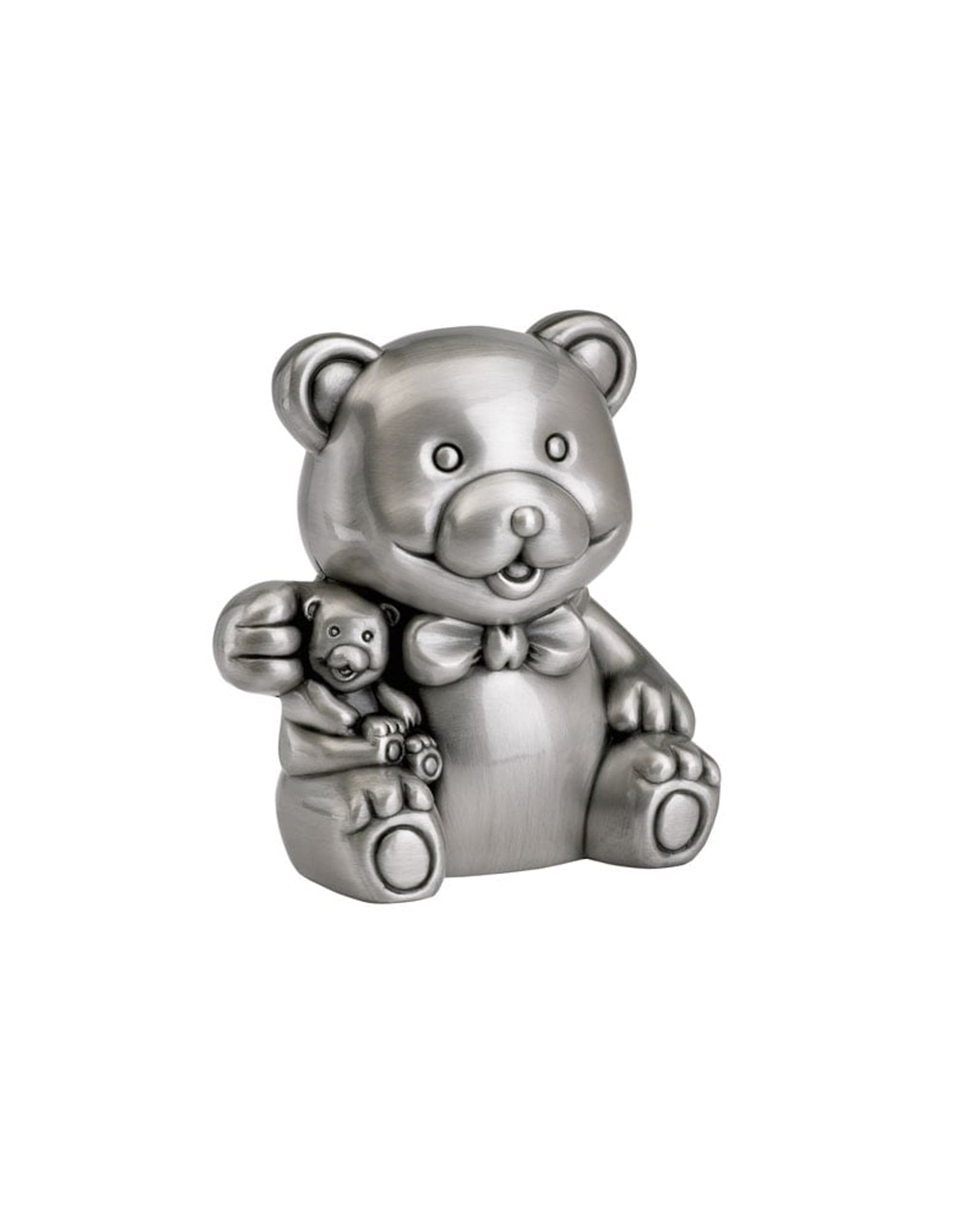 Sparebøsse i tinn formet som en teddybjørn. En tinnbjørn kan være til god hjelpe når det gjelder sparing for fremtiden. En fornuftig og fin dåpsgave.