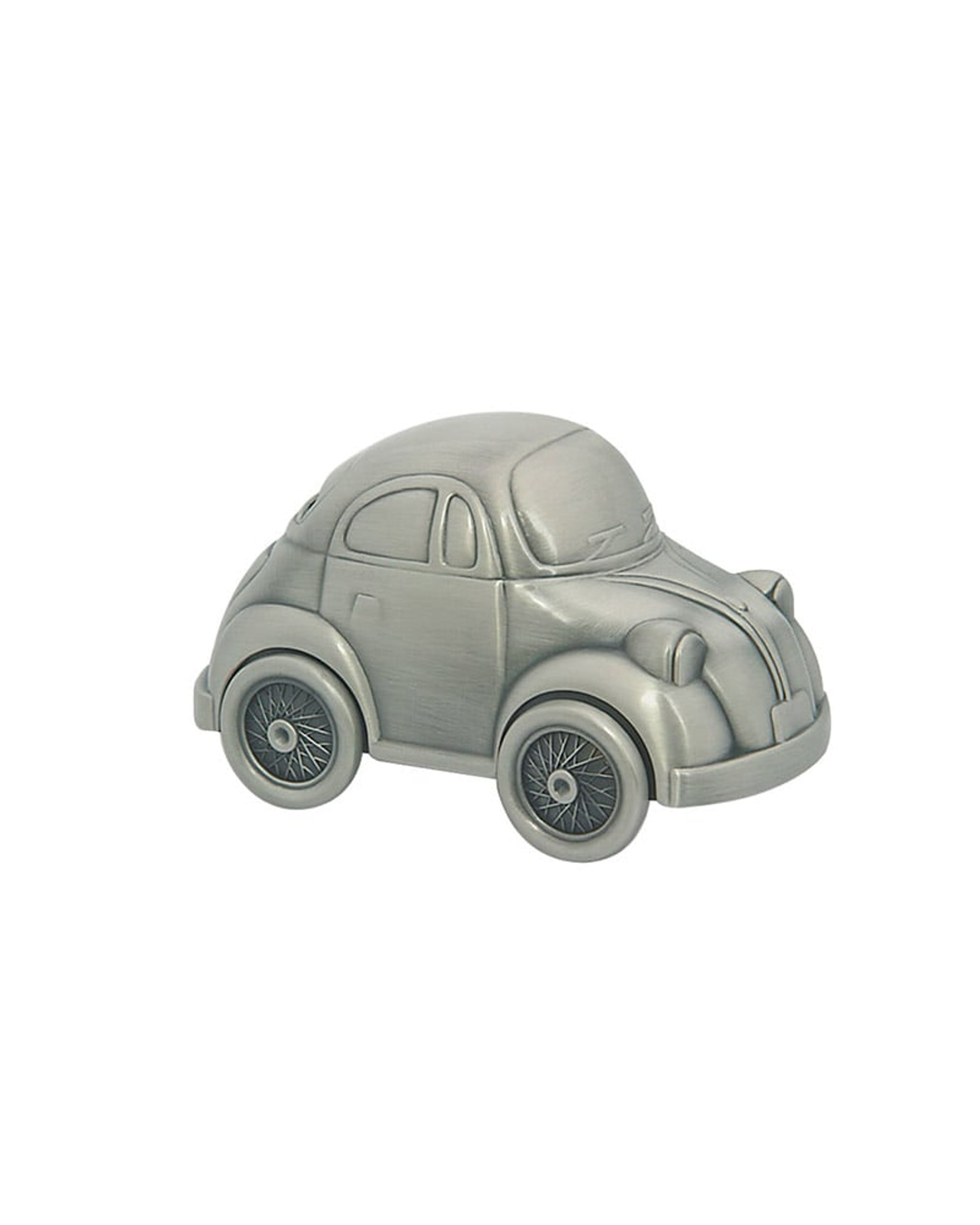 Sparebøsse i tinn formet som en bil. Passer godt til en guttebaby eller jentebaby som har en pappa som er bilentusiast en fin gave til dåpsbarnet.