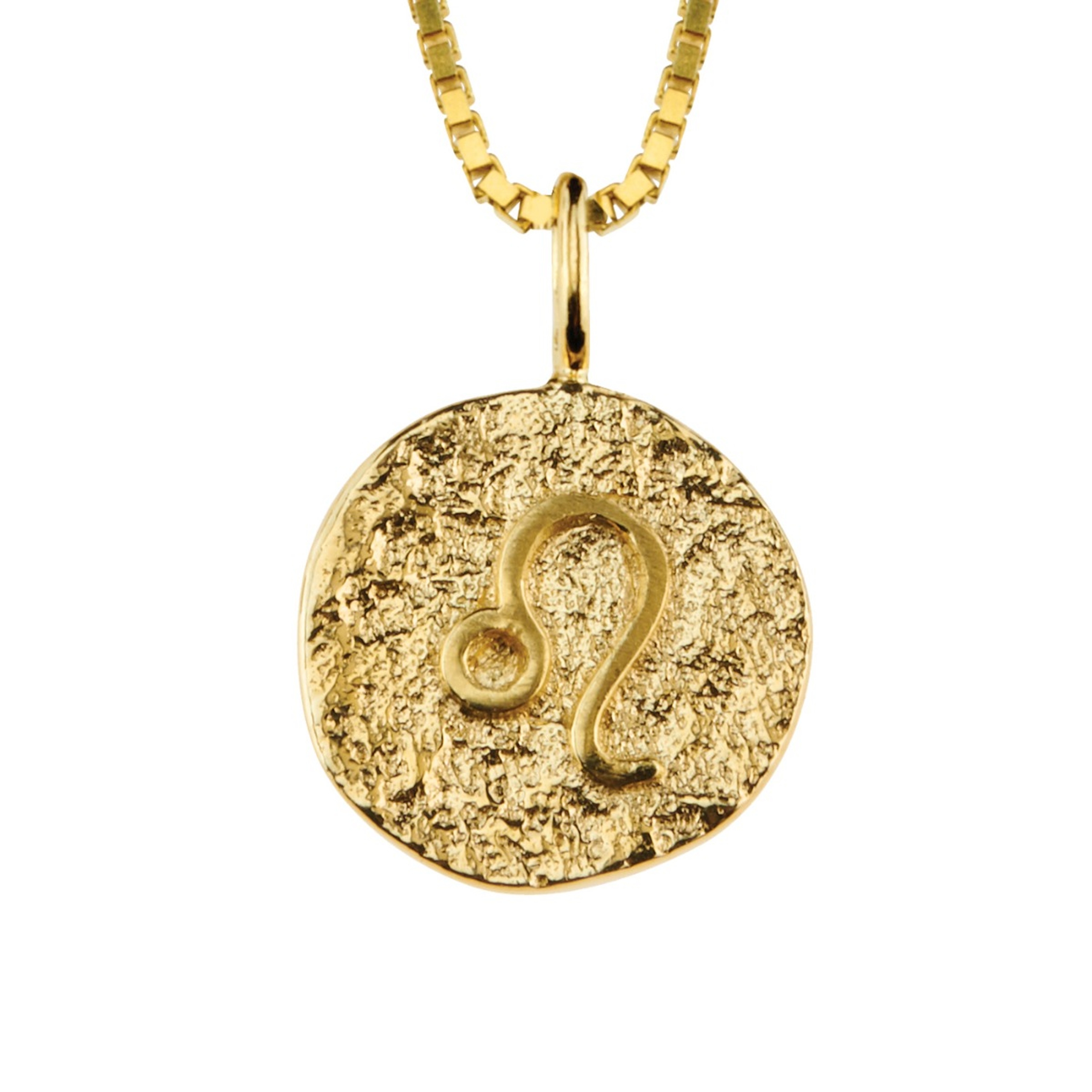 Et nydelig halssmykke laget i forgylt sølv med stjernetegnet Løven på en hamret plate. Dette halssmykket har flotte og spennende detaljer, og er utrolig kult å bruke i layering med andre smykker. Det følger med en kjede i forgylt sølv. Lengden er 42 cm.