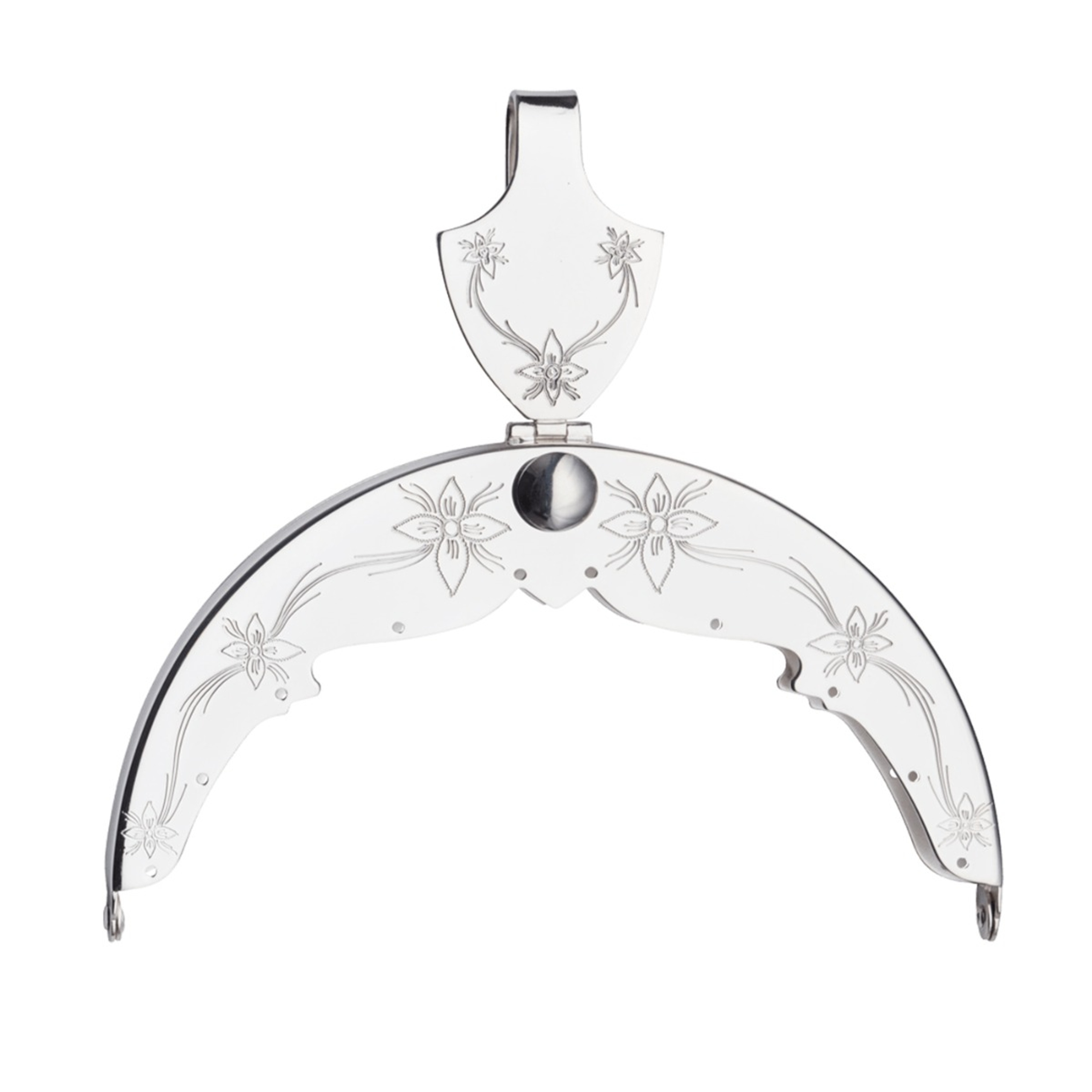 Nydelig og blank veskelås i forsølvet messing (Plett) til Rogalandsbunaden. Den har gravert dekor som passer godt inntil det vakre florabroderiet på bunaden.