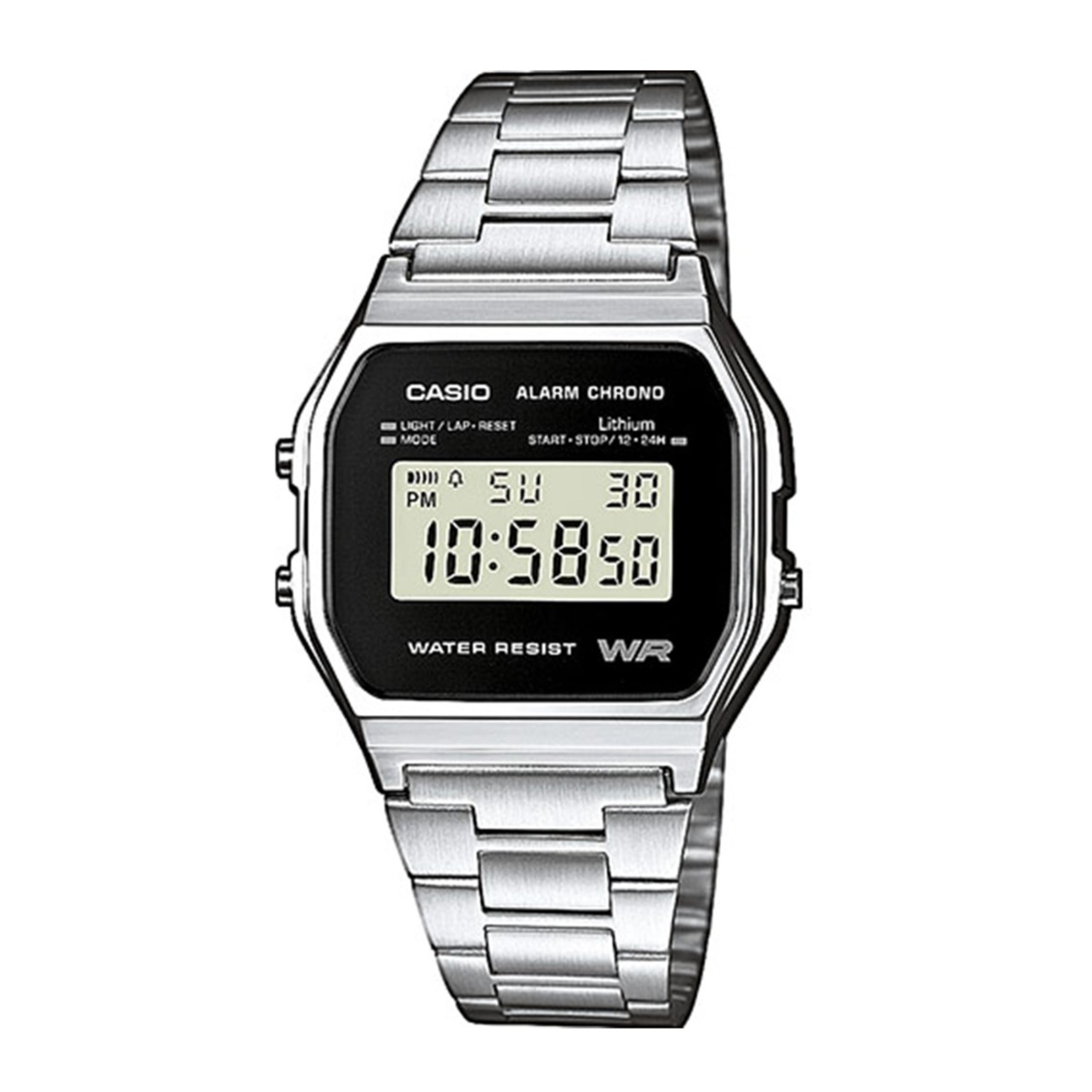 Denne stilige Casio klokken har et retroinspirert design med en rekke flotte funksjoner. Klokken har innebygd lys som lyser opp urskiven, stoppeklokke, dagsalarm og automatisk kalender. Urkassen er laget av resin og lenke i rustfritt stål med en justerbar spenne. Klokken tåler kun lett vannsprut, og kontakt med vann utover dette bør unngås.
