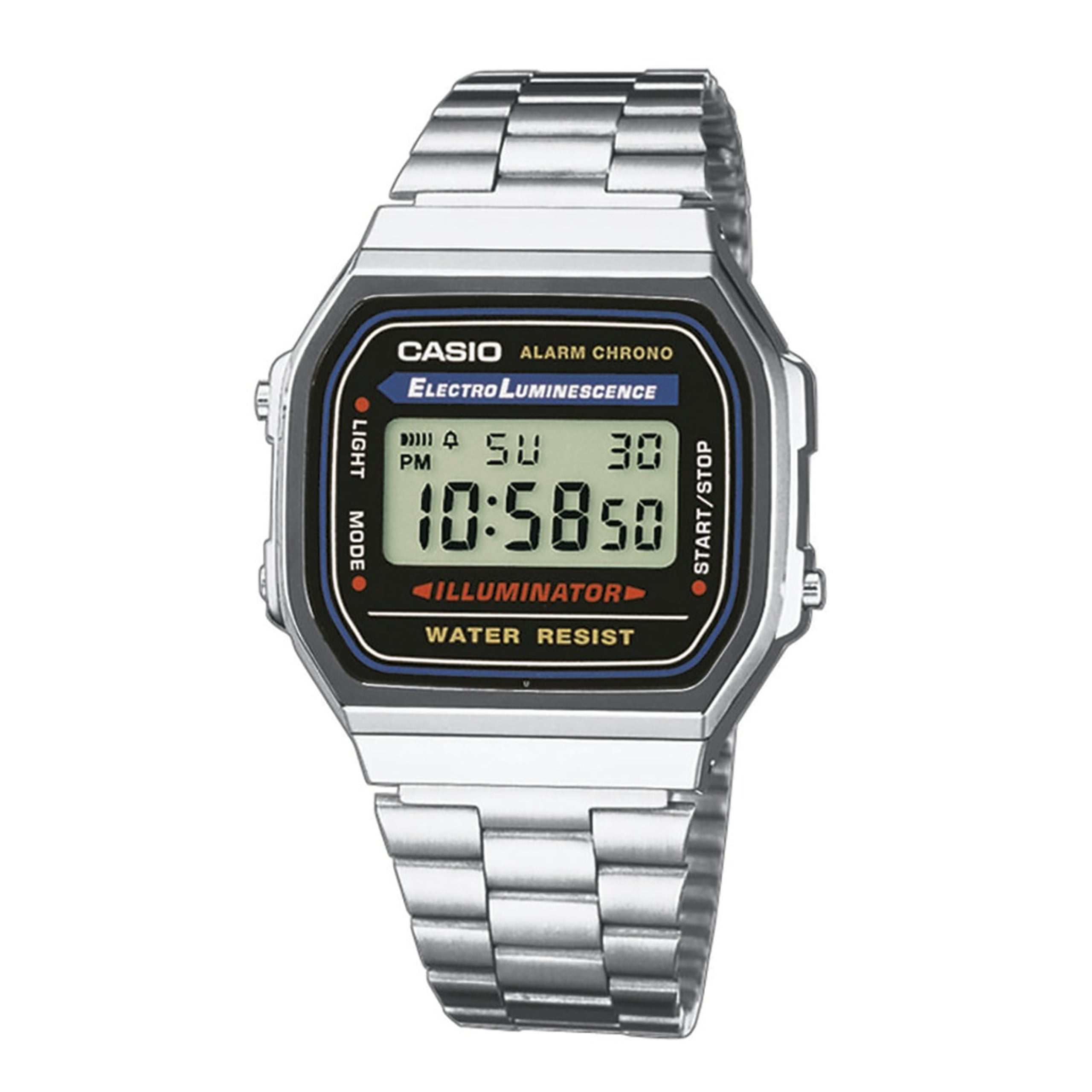 Digitalklokke fra Casio Vintage i skinnende sølvfarge med mange funksjoner som blant annet automatisk kalender, 12/24-timers tidsangivelse, selvlysende panel og dagsalarm. Urkassen er laget i resin, mens armbåndet er justerbart med spenne, og er laget i rustfritt stål. Klokken tåler kun lett vannsprut og bør ellers unngå vann utover det.